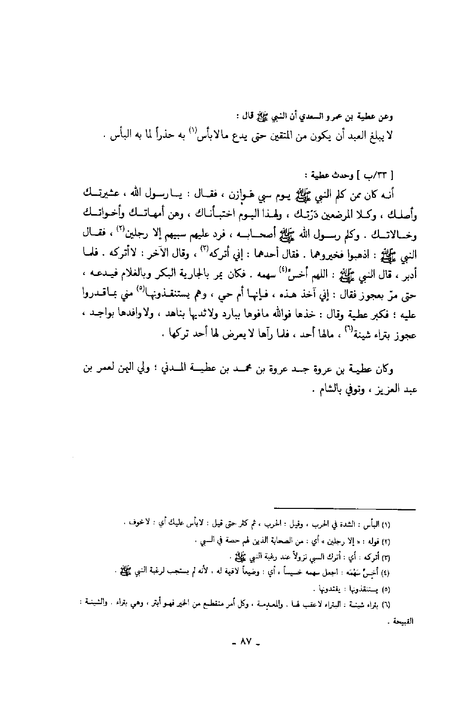 وحدث عطية: أنه كان ممن كلم النبي صَلَّى اللهُ عَلَيْهِ وَسَلَّمَ يوم سبي هوازن، فقال: يا رسول الله، عشيرتك وأصلك، وكلا المرضعين درّتك، ولهذا اليوم اختبأناك، وهن أمهاتك وأخواتك وخالاتك. وكلم رسول الله صَلَّى اللهُ عَلَيْهِ وَسَلَّمَ أصحابه، فرد عليهم سبيهم إلا رجلين، فقال النبي صَلَّى اللهُ عَلَيْهِ وَسَلَّمَ: " اذهبوا فخيروهما ". فقال أحدهما: إني أتركه، وقال الآخر: لا أتركه. فلما أدبر، قال النبي صَلَّى اللهُ عَلَيْهِ وَسَلَّمَ: " اللهم أخسّ سهمه ". فكان يمر بالجارية بالبكر وبالغلام فيدعه، حتى مرّ بعجوز فقال: إني آخذ هذه، فإنها أم حي، وهم يستنقذونها مني بما قدروا عليه؛ فكبر عطية وقال: خذها فوالله ما فوها ببارد ولا ثديها بناهد، ولا وافدها بواجد، عجوز بتراء شنية، مالها أحد، فلما رآها لا يعرض لها أحد تركها.