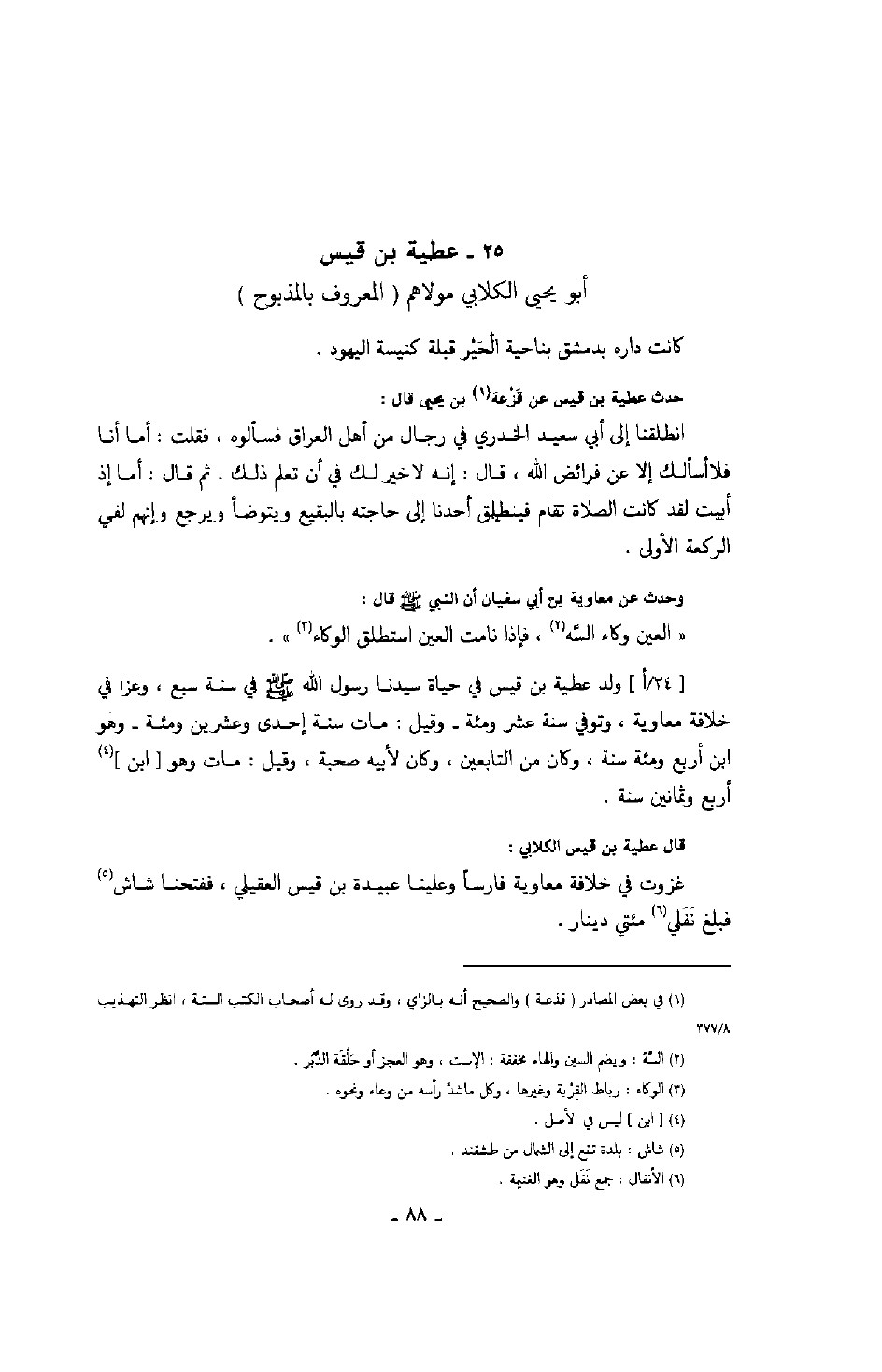 قال عطية بن قيس الكلابي: غزوت في خلافة معاوية فارساً وعلينا عبيدة بن قيس العقيلي، ففتحنا شاش فبلغ نفلي مئتي دينار.