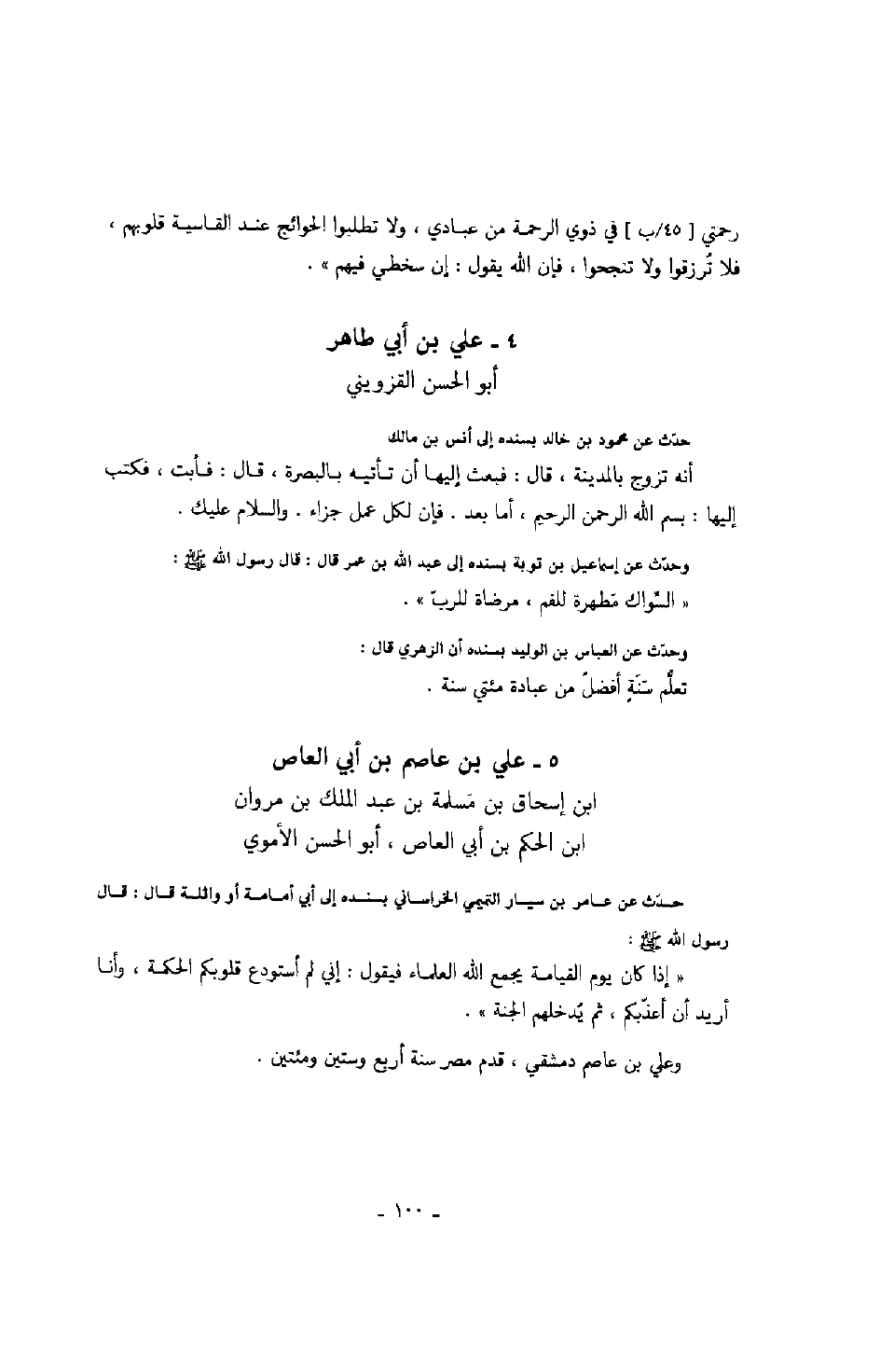 ابن إسحاق بن مسلمة بن عبد الملك بن مروان ابن الحكم بن أبي العاص، أبو الحسن الأموي حدّث عن عامر بن سيار التميمي الخراساني بسنده إلى أبي أمامة أو واثلة قال: قال رسول الله صلّى الله عليه وسلّم: " إذا كان يوم القيامة يجمع الله العلماء فيقول: إني لم أستودع قلوبكم الحكمة، وأنا أريد أن أعذّبكم، ثم يدخلهم الجنة ".