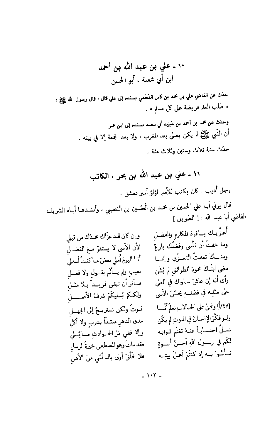 ابن أبي شعبة، أبو الحسن حدّث عن القاضي علي بن محمد بن كاس النّخعي بسنده إلى علي قال: قال رسول الله صلّى الله عليه وسلّم: " طلب العلم فريضة على كل مسلم ".