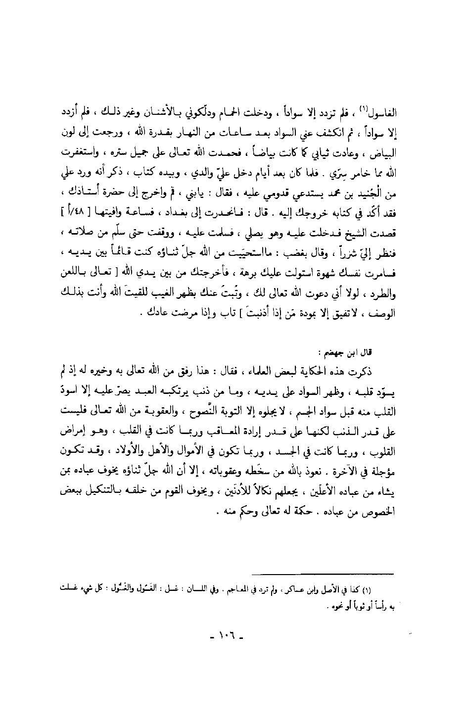 الغاسول، فلم تزدد إلا سواداً، ودخلت الحمام ودلّكوني بالأشنان وغير ذلك، فلم أزدد إلا سواداً، ثم انكشف عني السواد بعد ساعات من النهار بقدرة الله، ورجعت إلى لون البياض، وعادت ثيابي كما كانت بياضاً، فحمدت الله تعالى على جميل ستره، واستغفرت الله مما خامر سرّي. فلما كان بعد أيام دخل عليّ والدي، وبيده كتاب، وذكر أنه ورد علي من الجنيد بن محمد يستدعي قدومي عليه، فقال: يا بني، قم واخرج إلى حضرة أستاذك، فقد أكّد في كتابه خروجك إليه. قال: فانحدرت إلى بغداد، فساعة وافيتها قصدت الشيخ فدخلت عليه وهو يصلي، فسلمت عليه، ووقفت حتى سلّم من صلاته، فنظر إليّ شزراً، وقال بغضب: ما استحييت من الله جلّ ثناؤه كنت قائماً بين يديه، فسامرت نفسك شهوة استولت عليك برهة، فأخرجتك من بين يدي الله تعالى باللعن والطرد، ولولا أني دعوت الله تعالى لك، وتبت عنك بظهر الغيب للقيت الله وأنت بذلك الوصف، لا تفيق إلا بمودة من إذا أذنبت تاب وإذا مرضت عادك.