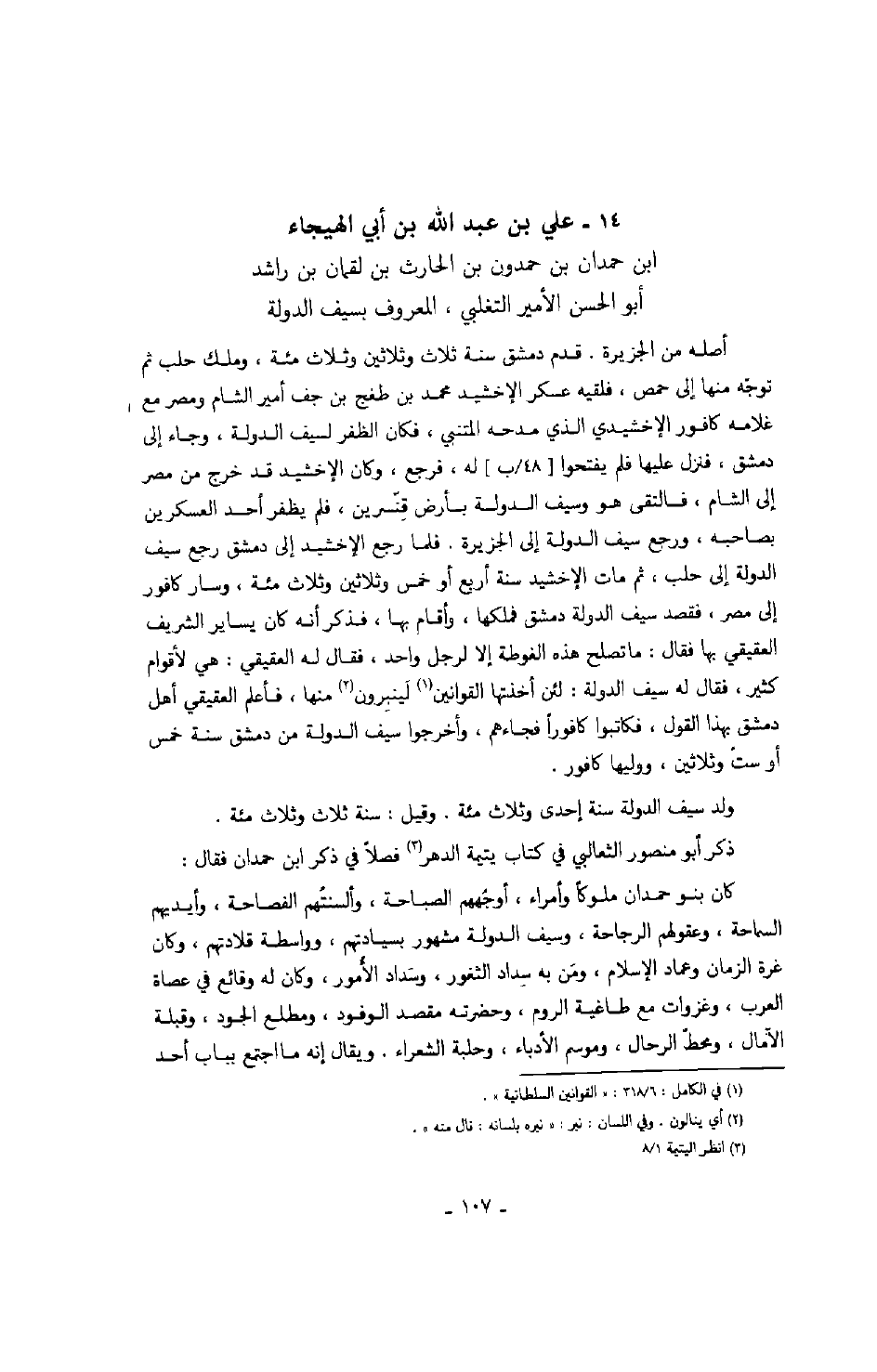 ابن الحارث بن لقمان بن راشد أبو الحسن الأمير التغلبي، والمعروف بسيف الدولة أصله من الجزيرة. قدم دمشق سنة ثلاث وثلاثين وثلاث مئة، وملك حلب ثم توجّه منها إلى حمص، فلقيه عسكر الإخشيد محمد بن طغج بنجف أمير الشام ومصر مع غلامه كافور الإخشيدي الذي مدحه المتنبي، فكان الظفر لسيف الدولة، وجاء إلى دمشق، فنزل عليها فلم يفتحوا له، فرجع، وكان الإخشيد قد خرج من مصر إلى الشام، فالتقى هو وسيف الدولة بأرض قنّسرين، فلم يظفر أحد العسكرين بصاحبه، ورجع سيف الدولة إلى الجزيرة. فلما رجع الإخشيد إلى دمشق رجع سيف الدولة إلى حلب، ثم مات الإخشيد سنة أربع أو خمس وثلاثين وثلاث مئة، وسار كافور إلى مصر، فقصد سيف الدولة دمشق فملكها، وأقام بها، فذكر أنه كان يساير الشريف العقيقي بها فقال: ما تصلح هذه الغوطة إلا لرجل واحد، فقال له العقيقي: هي لأقوام كثير، فقال له سيف الدولة: لئن أخذتها القوانين لينبرون منها، فأعلم العقيقي أهل دمشق بهذا القول، فكاتبوا كافوراً فجاءهم، وأخرجوا سيف الدولة من دمشق سنة خمس أو ستّ وثلاثين، ووليها كافور.