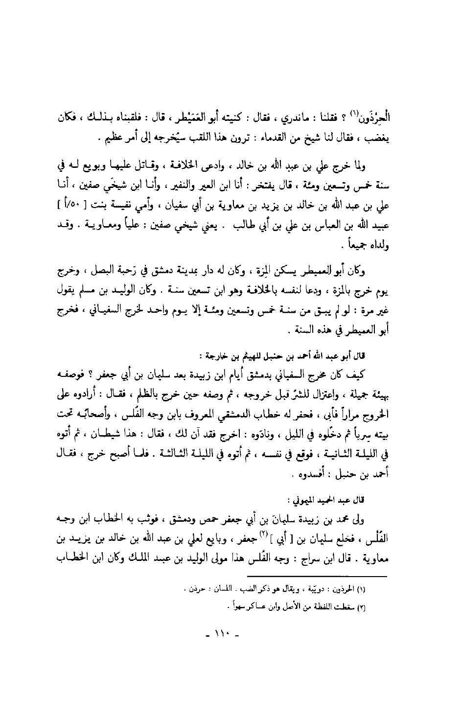 قال أبو عبد الله أحمد بن حنبل للهيثم بن خارجة: كيف كان مخرج السفياني بدمشق أيام ابن زبيدة بعد سليمان بن أبي جعفر؟ فوصفه بهيئة جميلة، واعتزال للشرّ قبل خروجه، ثم وصفه حين خرج بالظلم، فقال: أرادوه على الخروج مراراً فأبى، فحفر له خطاب الدمشقي المعروف بابن وجه الفلس، وأصحابه تحت بيته سرباً ثم دخّلوه في الليل، ونادوه: اخرج فقد آن لك، فقال: هذا شيطان، ثم أتوه في الليلة الثانية، فوقع في نفسه، ثم أتوه في الليلة الثالثة. فلما أصبح خرج، فقال أحمد بن حنبل: أفسدوه.
