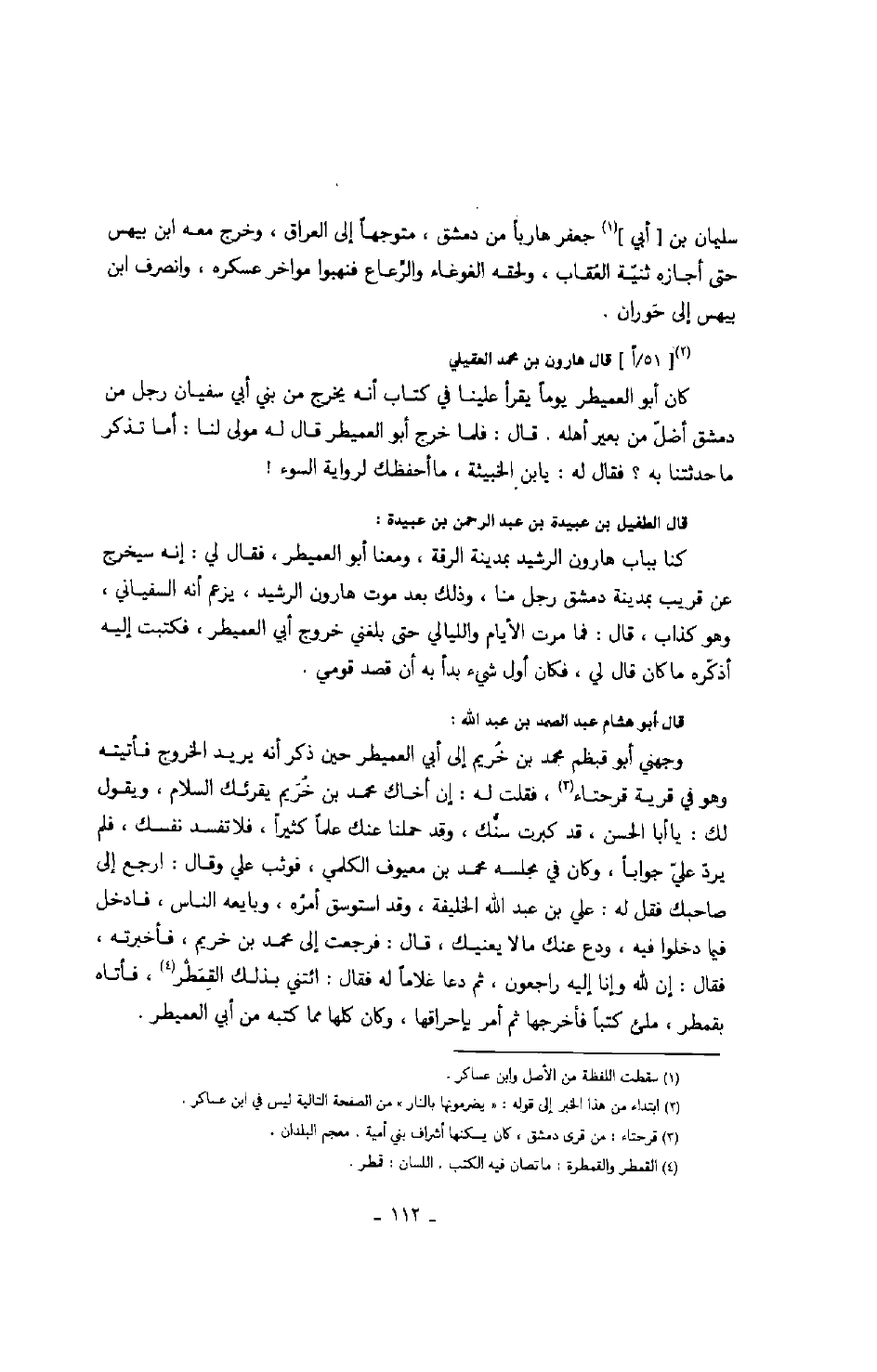 قال هارون بن محمد العقيلي كان أبو العميطر يوماً يقرأ علينا في كتاب أنه يخرج من بني أبي سفيان رجل من دمشق أضل من بعير أهله. قال: فلما خرج أبو العميطر قال له مولى لنا: أما تذكر ما حدثتنا به؟ فقال له: يا بن الخبيثة، ما أحفظك لرواية السوء! قال الطفيل بن عبيد ة بن عبد الرحمن بن عبيدة: كنا بباب هارون الرشيد بمدينة الرقة، ومعنا أبو العميطر، فقال لي: إنه سيخرج عن قريب بمدينة دمشق رجل منا، وذلك بعد موت هارون الرشيد، يزعم أنه السفياني، وهو كذاب، قال: فما مرت الأيام والليالي حتى بلغني خروج أبي العميطر، فكتبت إليه أذكّره ما كان قال لي، فكان أول شيء بدأ به أن قصد قومي.