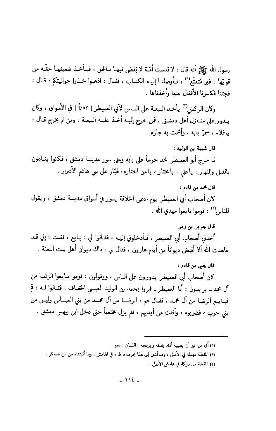 قال يحيى بن قادم: كان أصحاب أبي العميطر يدورون على الناس، ويقولون: قوموا بايعوا الرضا من آل محمد يريدون: أبا العميطر فمروا بمحمد بن الوليد العبسي الخفاف، فقالوا له: قم فبايع الرضا من آل محمد، فقال لهم: الرضا من آل محمد من بني العباس وليس من بني حرب، فضربوه، وأفلت من أيديهم، فلم يزل مختفياً حتى دخل ابن بيهس دمشق.