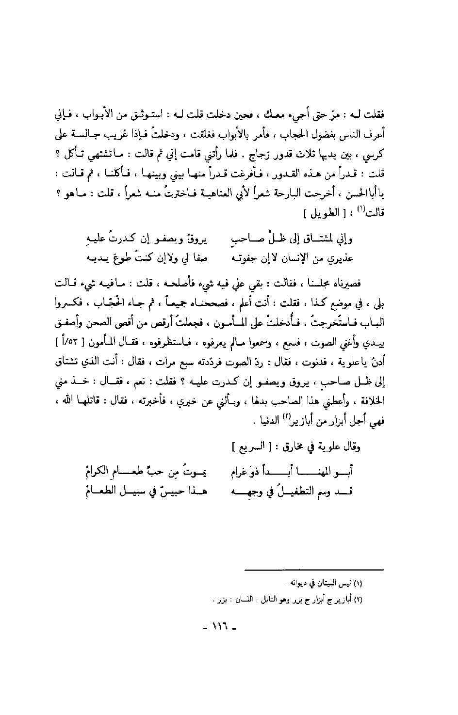 فقلت له: مرّ حتى أجيء معك، فحين دخلت قلت له: استوثق من الأبواب، فإني أعرف الناس بفضول الحجاب، فأمر بالأبواب فغلقت، ودخلت فإذا عريب جالسة على كرسي، بين يديها ثلاث قدور زجاج. فلما رأتني قامت إلي ثم قالت: ما تشتهي تأكل؟ قلت: قدراً من هذه القدور، فأفرغت قدراً منها بيني وبينها، فأكلنا، ثم قالت: يا أبا الحسن، أخرجت البارحة شعراً لأبي العتاهية فاخترت منه شعراً، قلت: ما هو؟ قالت: الطويل