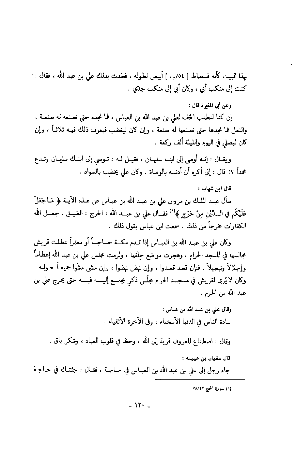 وكان علي بن عبد الله بن العباس إذا قدم مكة حاجاً أو معتمراً عطلت قريش مجالسها في المسجد الحرامن وهجرت مواضع حلقها، ولزمت مجلس علي بن عبد الله إعظاماً وإجلالاً وتبجيلاً. فإن قعد قعدوا، وإن نهض نهضوا، وإن مشى مشوا جميعاً حوله، وكان لا يرى لقريش في مسجد الحرام مجلس ذكرٍ يجتمع إليه فيه حتى يخرج علي بن عبد الله من الحرم.