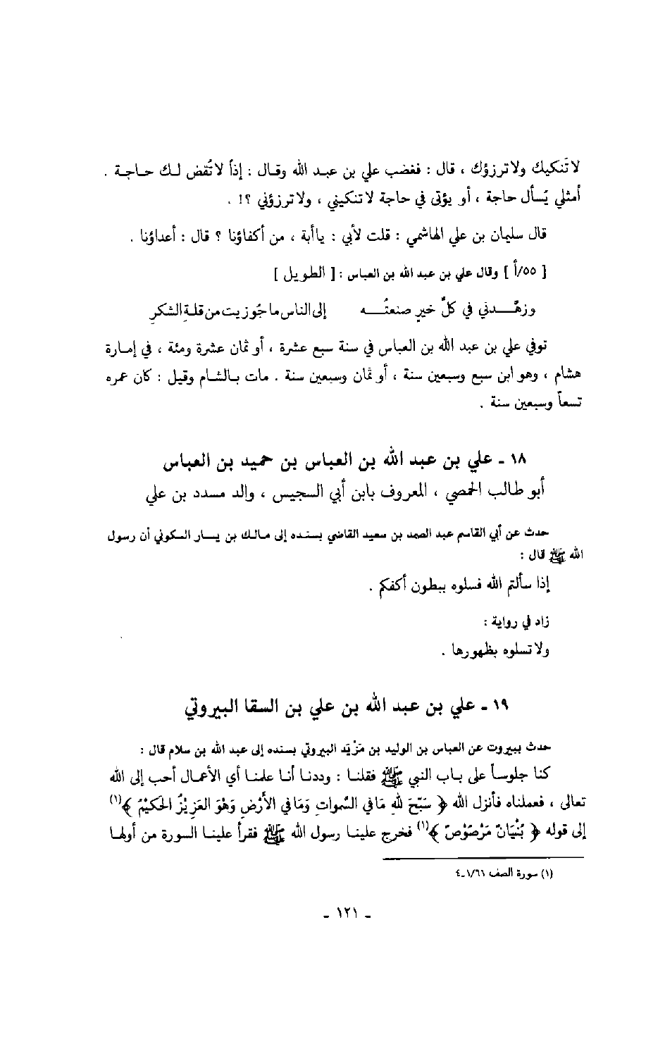 حدث ببيروت عن العباس بن الوليد بن مزيد البيروتي بسنده إلى عبد الله بن سلام قال: كنا جلوساً على باب النبي صلّى الله عليه وسلّم فقلنا: وددنا أن علمنا أي الأعمال أحب إلى الله تعالى، فعملناه فأنزل الله " سبّح لله ما في السّموات وما في الأرض وهو العزيز الحكيم " إلى قوله " بنيانٌ مرصوصٌ " فخرج علينا رسول الله صلّى الله عليه وسلّم فقرأ علينا السورة من أولها