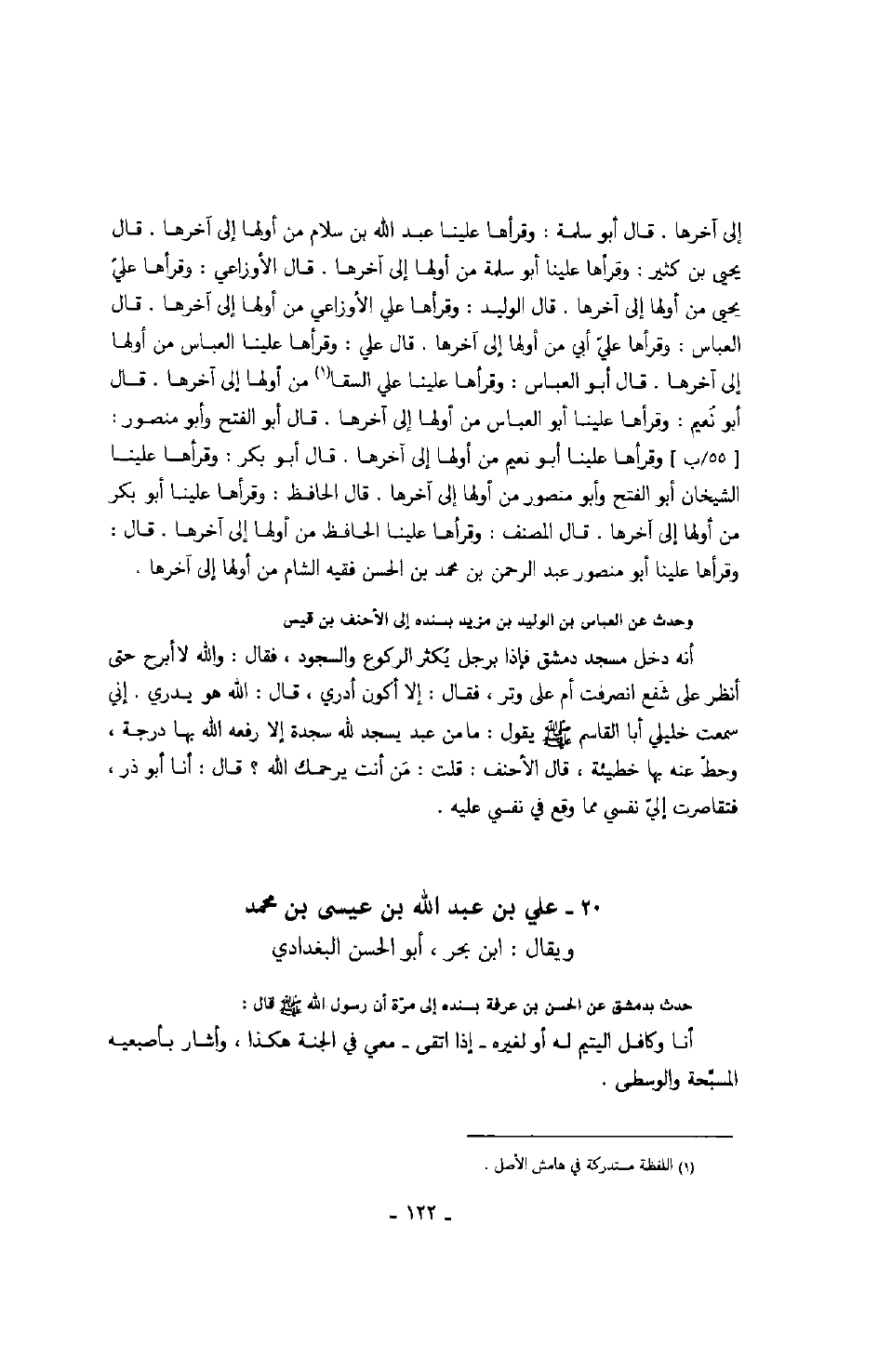 ويقال: ابن بحر، أبو الحسن البغدادي حدث بدمشق عن الحسن بن عرفة بسنده إلى مرّة أن رسول الله صلّى الله عليه وسلّم قال: " أنا وكافل اليتيم له أو لغيره إذا اتقى معي في الجنة هكذا "، وأشار بأصبعيه المسبّحة والوسطى.