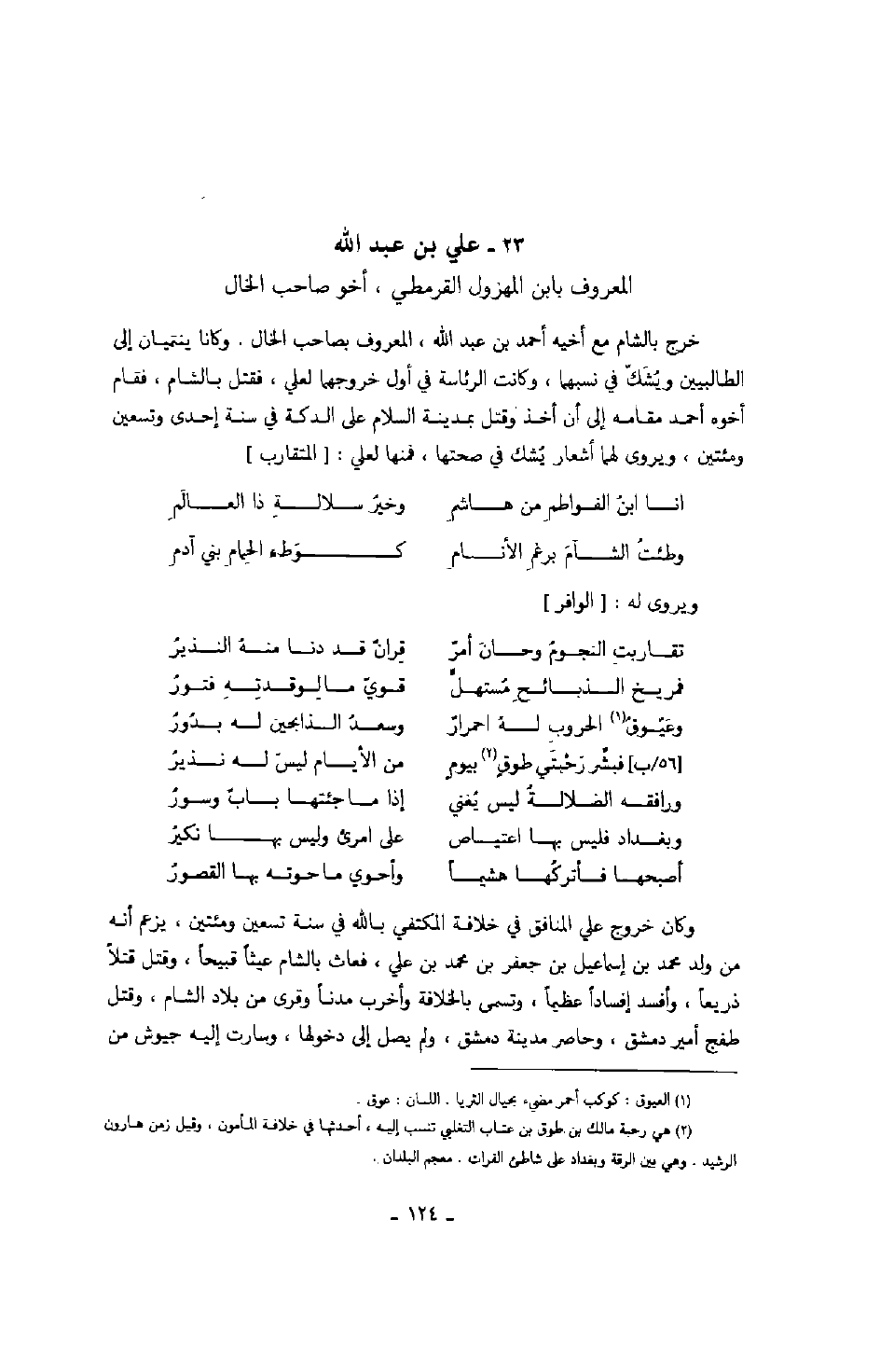 المعروف بابن المهزول القرمطي، أخو صاحب الخال خرج بالشام مع أخيه أحمد بن عبد الله، المعروف بصاحب الخال. وكانا ينتميان إلى الطالبيين ويشكّ في نسبهما، وكانت الرئاسة في أول خروجهما لعلي، فقتل بالشام، فقام أخوه أحمد مقامه إلى أن أخذ وقتل بمدينة السلام على الدكة في سنة إحدى وتسعين ومئتين، ويروى لهما أشعار يشك في صحتها، فمنها لعلي: المتقارب