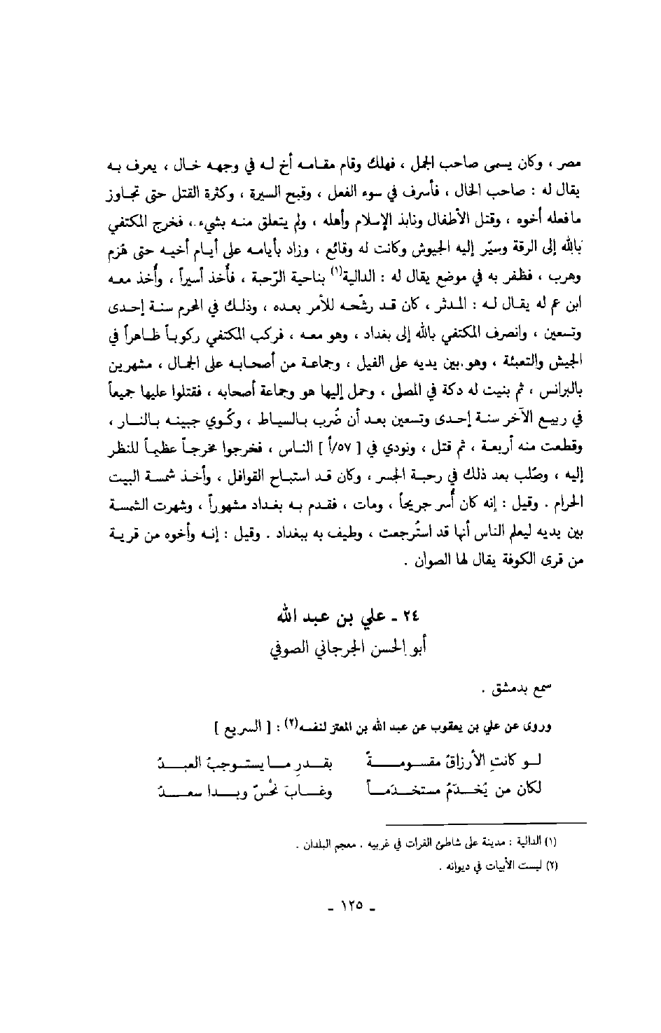 مصر، وكان يسمى صاحب الجمل، فهلك وقام مقامه أخل له في وجهه خال، يعرف به يقال له: صاحب الخال، فأسرف في سوء الفعل، وقبح السيرة، وكثرة القتل حتى تجاوز ما فعله أخوه، وقتل الأطفال ونابذ الإسلام وأهله، ولم يتعلق منه بشيء، فخرج المكتفي بالله إلى الرقة وسيّر إليه الجيوش وكانت له وقائع، وزاد بأيامه على أيام أخيه حتى هزم وهرب، فظفر به في موضع يقال له: الدالية بناحية الرّحبة، فأخذ أسيراًن وأخذ معه ابن عم له يقال له: المدثر، كان قد رشّحه للأمر بعده، وذلك في المحرم سنة إحدى وتسعين، وانصرف المكتفي بالله إلى بغداد، وهو معه، فركب المكتفي ركوباً ظاهراً في الجيش والتعبئة، وهو بين يديه على الفيل، وجماعة من أصحابه على الجمال، مشهرين بالبرانس، ثم بنيت له دكة في المصلى، وحمل إليها هو وجماعة أصحابه، فقتلوا عليها جميعاً في ربيع الآخر سنة إحدى وتسعين بعد أن ضرب بالسياط، وكوي جبينه بالنار، وقطعت منه أربعة، ثم قتل، ونودي في الناس، فخرجوا مخرجاً عظيماً للنظر إليه، وصلب بعد ذلك في رحبة الجسر، وكان قد استباح القوافل، وأخذ شمسة البيت الحرام. وقيل: إنه كان أسر جريحاً، ومات، فقدم به بغداد مشهوراً، وشهرت الشمسة بين يديه ليعلم الناس أنها قد استرجعت، طيف به ببغداد. وقيل: إنه وأخوه من قرية من قرى الكوفة يقال لها الصوان.