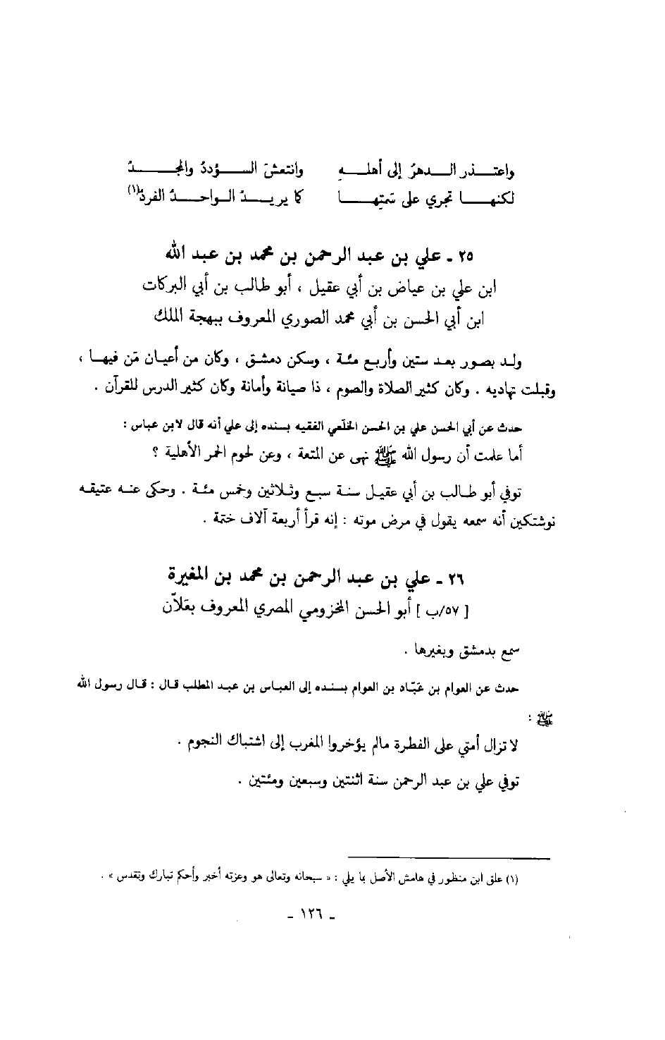 حدث عن العوام بن عبّاد بن العوام بسنده إلى العباس بن عبد المطلب قال: قال رسول الله صلّى الله عليه وسلّم: " لا تزال أمتي على الفطرة ما لم يؤخروا المغرب إلى اشتباك النجوم ".