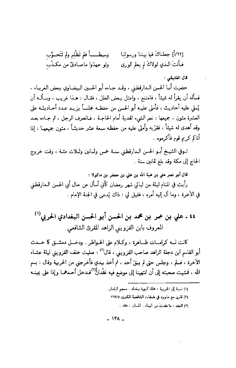 أبو الحسن البغدادي الحربي المعروف بابن القزويني الزاهد المقرئ الشافعي كانت له كرامات ظاهرة، وكلام على الخواطر. ودخل دمشق كما حدث أبو القاسم ابن دجلة الزاهد صاحب القزويني، قال: صليت خلف القزويني ليلة عشاء الآخرة، فسلم، وجلس حتى لم يبق أحد، ثم أخذ بيدي فأخرجني من الحربية وقال: بسم الله، فمشيت صحبته إلى أن انتهينا إلى موضع فيه عقدان فدخل أحدهما وإذا على يمينه
