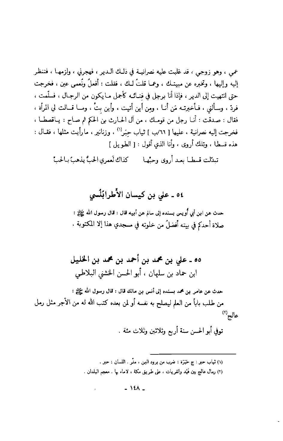 ابن محمد بن الخليل بن حماد بن سليمان، أبو الحسن الخشني البلاطي حدث عن عامر بن محمد بسنده إلى أنس بن مالك قال: قال رسول الله صلّى الله عليه وسلّم: " من طلب باباً من العلم ليصلح به نفسه أو لمن بعده كتب الله له من الأجر مثل رمل عالج ".