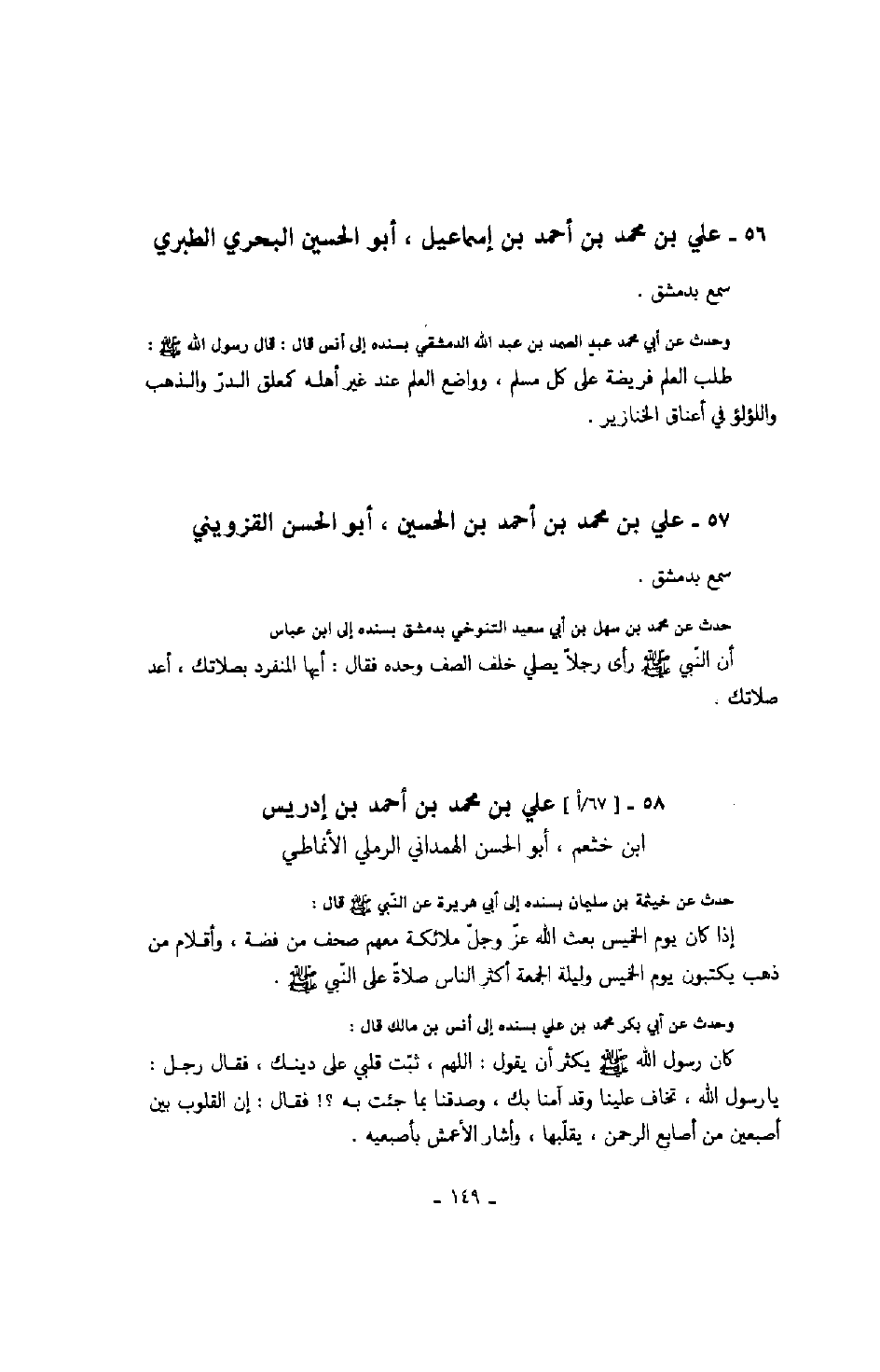 وحدث عن أبي محمد عبد الصمد بن عبد الله الدمشقي بسنده إلى أنس قال: قال رسول الله صلّى الله عليه وسلّم: " طلب العلم فريضة على كل مسلم، وواضع العلم عند غير أهله كمعلق الدرّ والذهب واللؤلؤ في أعناق الخنازير ".