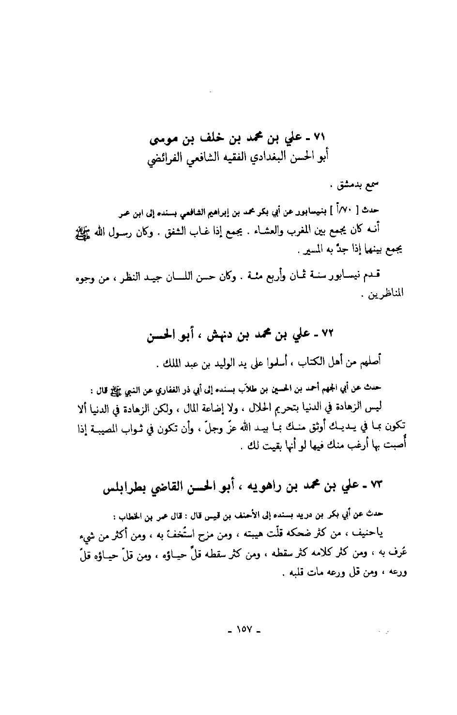 حدث عن أبي الجهم أحمد بن الحسين بن طلاّب بسنده إلى أبي ذر الغفاري عن النبي صلّى الله عليه وسلّم قال: " ليس الزهادة في الدنيا بتحريم الحلال، ولا إضاعة المال، ولكن الزهادة في الدنيا ألا تكون بما في يديك أوثق منك بما بيد الله عزّ وجلّ، وأن تكون في ثواب المصيبة إذا أصبت بها أرغب منك فيها لو أنها بقيت لك ".