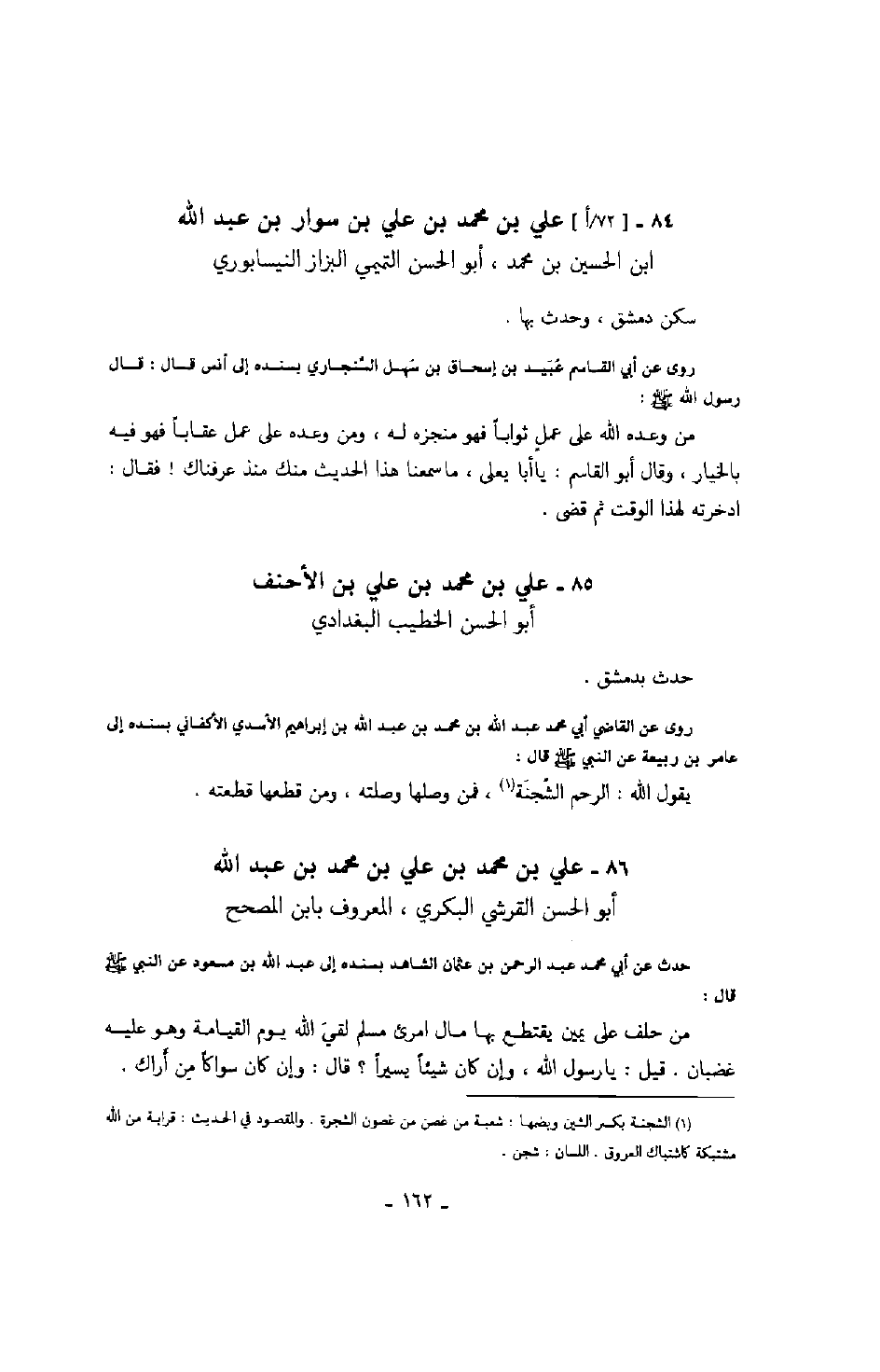 أبو الحسن القرشي البكري، المعروف بابن المصحح حدث عن أبي محمد عبد الرحمن بن عثمان الشاهد بسنده إلى عبد الله بن مسعود عن النبي صلّى الله عليه وسلّم قال: " من حلف على يمين يقتطع بها مال امرئ مسلم لقي الله يوم القيامة وهو عليه غضبان ". قيل: يا رسول الله، وإن كان شيئاً يسيراً؟ قال: " وإن كان سواكاً من أراك ".