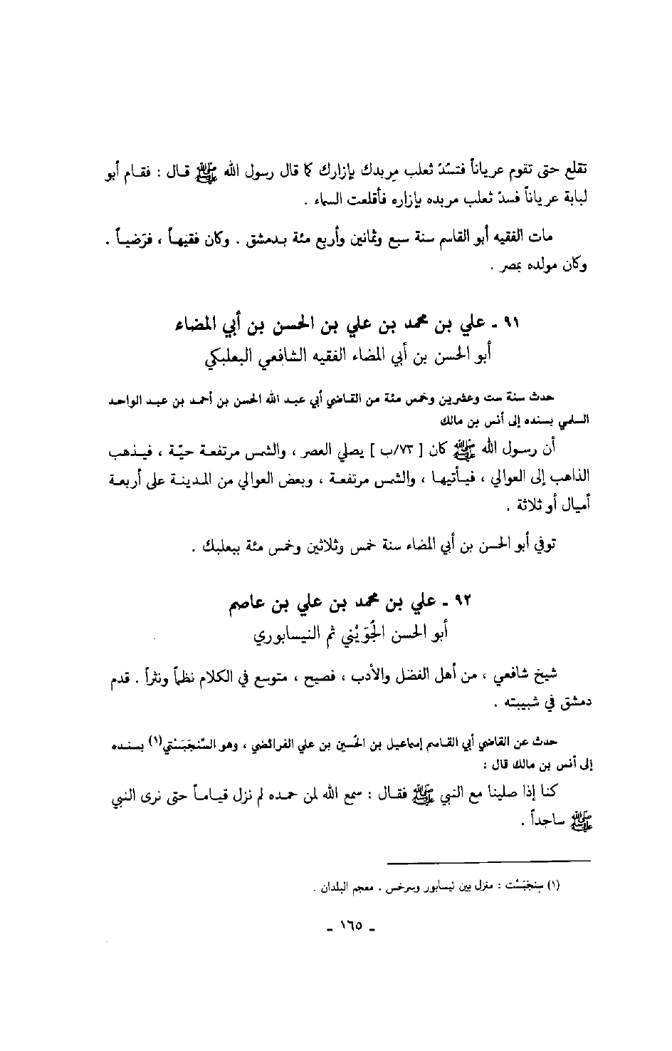 أبو الحسن بن أبي المضاء الفقيه الشافعي البعلبكي حدث سنة ست وعشرين وخمس مئة من القاضي أبي عبد الله الحسن بن أحمد بن عبد الواحد السلمي بسنده إلى أنس بن مالك أن رسول الله صلّى الله عليه وسلّم كان يصلي العصر، والشمس مرتفعة حيّة، فيذهب الذاهب إلى العوالي، فيأتيها، والشمس مرتفعة، وبعض العوالي من المدينة على أربع أميال أو ثلاثة.