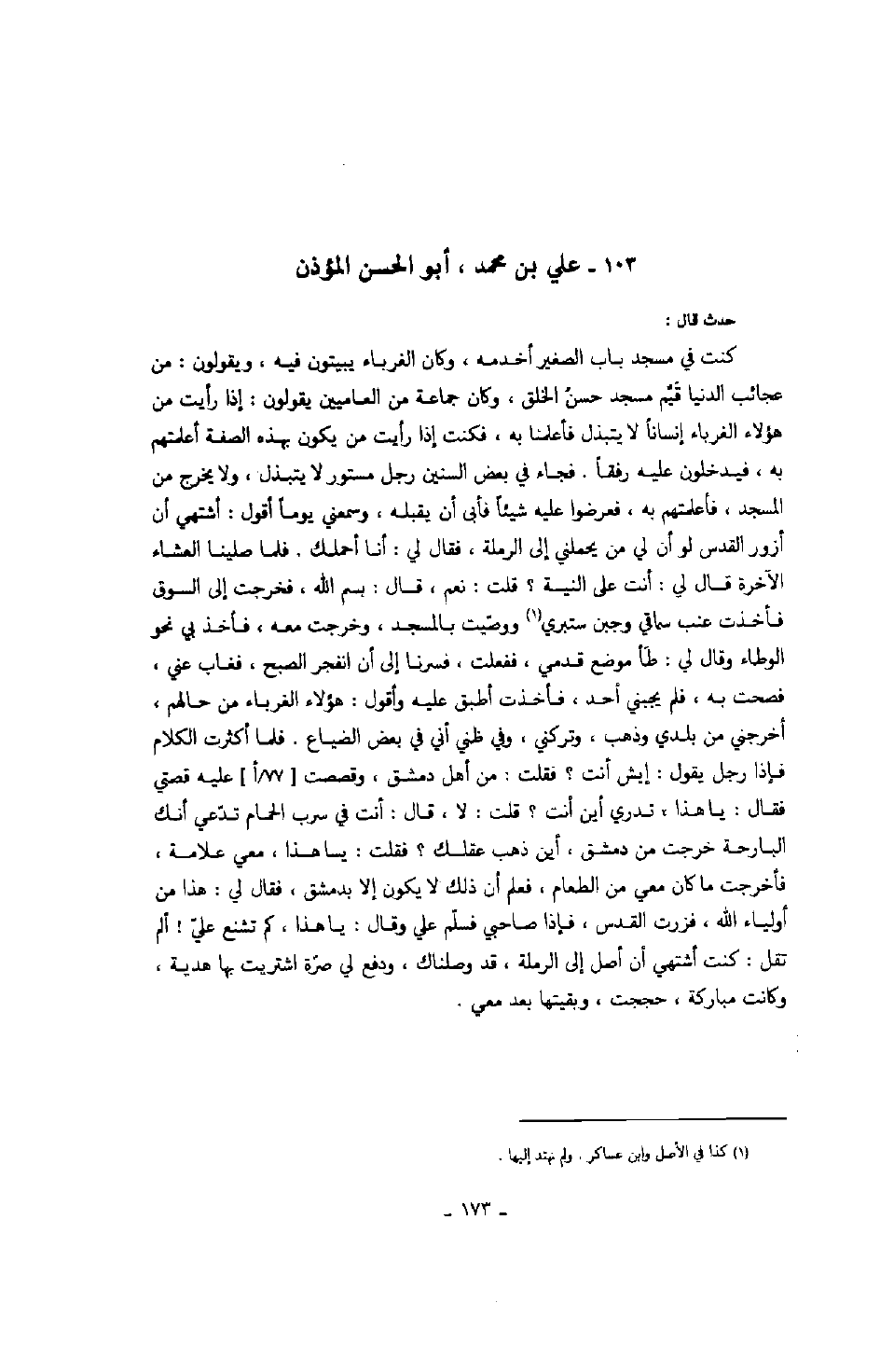 كنت في مسجد باب الصغير أخدمه، وكان الغرباء يبيتون فيه، ويقولون: من عجائب الدنيا قيّم مسجد حسن الخلق، وكان جماعة من العاميين يقولون: إذا رأيت من هؤلاء الغرباء إنساناً لا يتبذل فأعلمنا به، فكنت إذا رأيت من يكون بهذه الصفة أعلمتهم به، فيدخلون عليه رفقاً. فجاء في بعض السنين رجل مستور لا يتبذل، ولا يخرج من المسجد، فأعلمتهم به، فعرضوا عليه شيئاً فأبى أن يقبله، وسمعني يوماً أقول: أشتهي أن أزور القدس لو أن لي من يحملني إلى الرملة، فقال لي: أنا أحملك. فلما صلينا العشاء الآخرة قال لي: أنت على النية؟ قلت: نعم، قال: بسم الله، فخرجت إلى السوق فأخذت عنب سماقي وجبن ستبري ووصّيت بالمسجد، وخرجت معه، فأخذ بي نحو الوطاء وقال: طأ موضع قدمي، ففعلت، فسرنا إلى أن انفجر الصبح، فغاب عني، فصحت به، فلم يجبني أحد، فأخذت أطبق عليه فأقول: هؤلاء الغرباء من حالهم، أخرجني من بلدي وذهب، وتركني، وفي ظني أني في بعض الضياع. فلما أكثرت الكلام فإذا رجل يقول: إيش أنت؟ فقلت: من أهل دمشق، وقصصت عليه قصتي فقال: يا هذا، تدري أين أنت؟ قلت: لا، قال: أنت في سرب الحمام تدّعي أنك البارحة خرجت من دمشق، أين ذهب عقلك؟ فقلت: يا هذا، معي علامة، فأخرجت ما كان معي من الطعام، فعلم أن ذلك لا يكون إلا بدمشق، فقال لي: هذا من أولياء الله، فزرت القدس، فإذا صاحبي فسلّم علي وقال: يا هذا، كم تشنع عليّ! ألم نقل: كنت أشتهي أن أصل إلى الرملة، قد وصلناك، ودفع لي صرّة اشتريت بها هدية، وكانت مباركة، حججت، وبقيتها بعد معي.