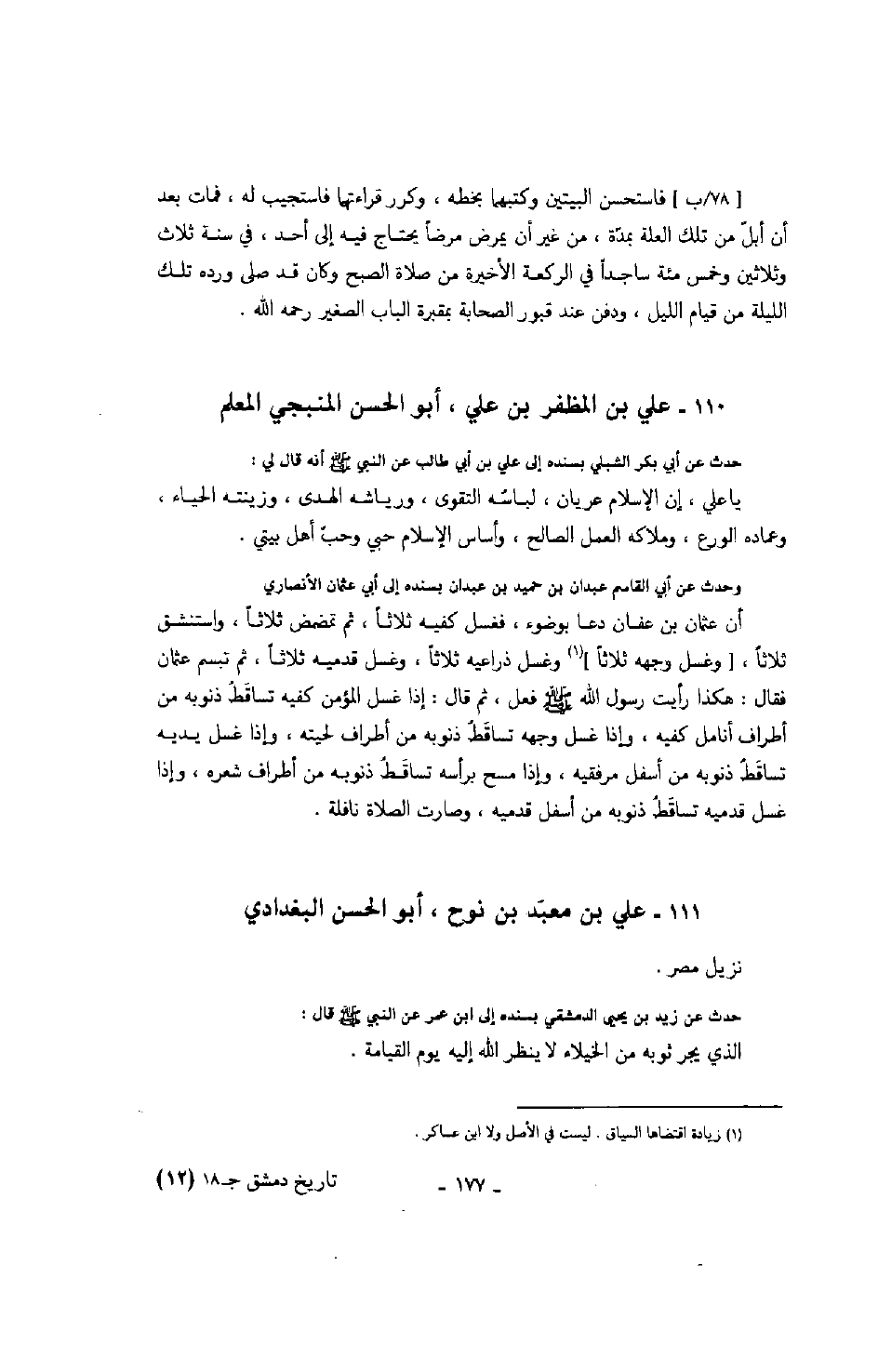 وحدث عن أبي القاسم عبدان بن حميد بن عبدان بسنده إلى أبي عثمان الأنصاري أن عثمان بن عفان دعا بوضوء، فغسل كفيه ثلاثاً، ثم تمضمض ثلاثاً، واستنشق ثلاثاً، وغسل وجهه ثلاثاً، وغسل ذراعيه ثلاثاً، وغسل قدميه ثلاثاً، ثم تبسم عثمان فقال: هكذا رأيت رسول الله صلّى الله عليه وسلّم فعل، ثم قال: " إذا غسل المؤمن كفيه تساقط ذنوبه من أطراف أنامل كفيه، وإذا غسل وجهه تساقط ذنوبه من أطراف لحيته، وإذا غسل يديه تساقط ذنوبه من أسفل مرفقيه، وإذا مسح برأسه تساقط ذنوبه من أطراف شعره، وإذا غسل قدميه تساقط ذنوبه من أسفل قدميه، وصارت الصلاة نافلة ".