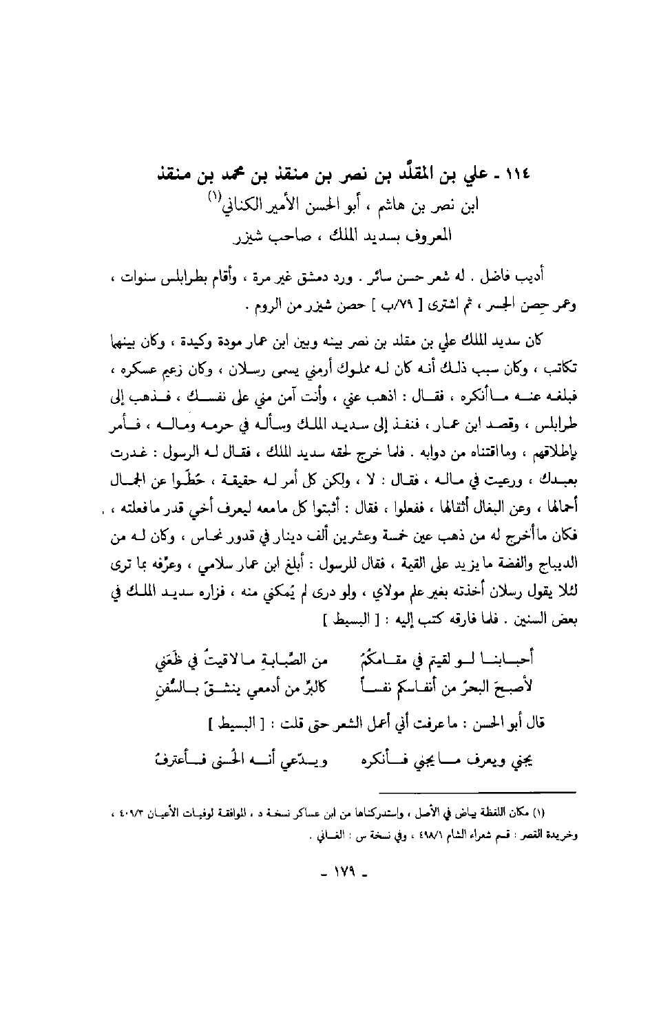 ابن نصر بن هاشم، أبو الحسن الأمير الكناني المعروف بسديد الملك، صاحب شيزر أديب فاضل. له شعر حسن سائر. ورد دمشق غير مرة، وأقام بطرابلس سنوات، وعمر حصن الجسر، ثم اشترى حصن شيزر من الروم.