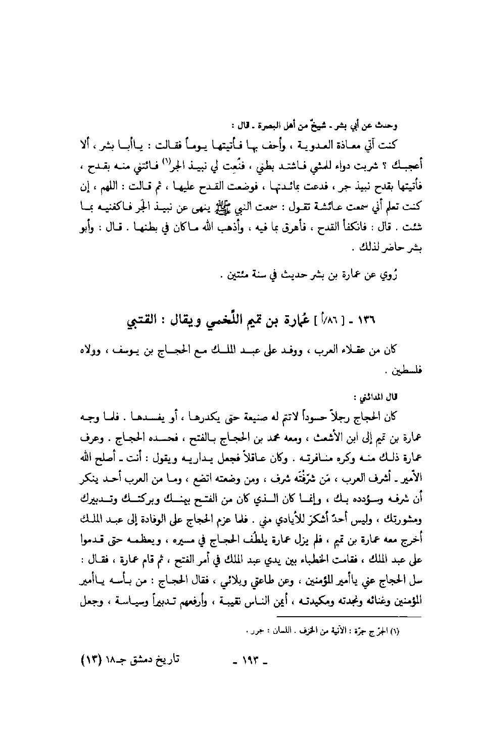 قال المدائني: كان الحجاج رجلاً حسوداً لا تتم له صنيعة حتى يكدرها، أو يفسدها. فلما وجه عمارة بن تميم إلى ابن الأشعث، ومعه محمد بن الحجاج بالفتح، فحسده الحجاج. وعرف عمارة ذلك منه وكره منافرته. وكان عاقلاً فجعل يداريه ويقول: أنت أصلح الله الأمير ت أشرف العرب، من شرّفته شرف، ومن وضعته اتضع، وما من العرب أحد ينكر أن شرفه وسؤدده بك، وإنما كان الذي كان من الفتح بيمنك وبكرتك وتدبيرك ومشورتك، وليس أحدق أشكر للأيادي مني. فلما عزم الحجاج على الوفادة إلى عبد الملك أخرج معه عمارة بن تميم، فلم يزل عمارة يلطف الحجاج في مسيره، ويعظمه حتى قدموا على عبد الملك، فقامت الخطباء بين يدي عبد الملك في أمر الفتح، ثم قام عمارة، فقال: سل الحجاج عني يا أمير المؤمنين، وعن طاعتي وبلائي، فقال الحجاج: من بأسه يا أمير المؤمنين وغنائه ونجدته ومكيدته، أيمن الناس نقيبة، وأرفعهم تدبيراً وسياسة، وجعل