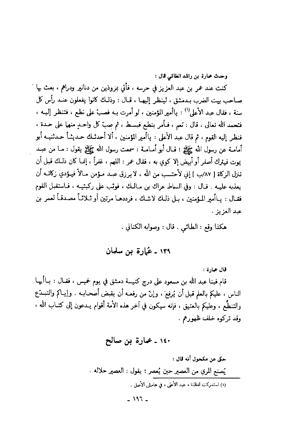 قال عمارة: قام فينا عبد الله بن مسعود على درج كنيسة دمشق في يوم خميس، فقال: يا أيها الناس، عليكم بالعلم قبل أن يرفع، وإنّ من رفعه أن يقبض أصحابه. وإياكم والتبدّع والتنطّع، وعليكم بالعتيق، فإنه سيكون في آخر هذه الأمة أقوام يدعون إلى كتاب الله، وقد تركوه خلف ظهورهم.