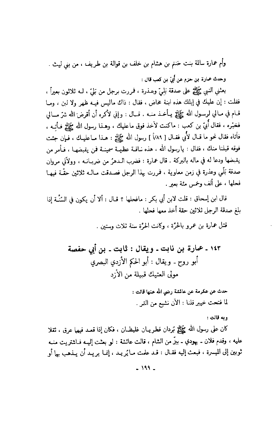 بعثني النبي صلّى الله عليه وسلّم على صدقة بليّ وعذرة، فمررت برجل من بليّ، له ثلاثون بعيراً، فقلت: إن عليك في إبلك هذه ابنة مخاض، فقال: ذلك ما ليس فيه ظهر ولا لبن، وما قام في مالي لرسول الله صلّى الله عليه وسلّم يأخذ منه. قال: وإني لأكره أن أقرض الله شرّ مالي فخبّره، فقال أبيّ بن كعب: ما كنت لآخذ فوق ما عليك، وهذا رسول الله صلّى الله عليه وسلّم فأته، فأتاه فقال نحو ما قال لأبي فقال رسول الله صلّى الله عليه وسلّم: " هذا ما عليك، فإن جئت فوقه قبلنا منك، فقال: يا رسول الله صلّى الله عليه وسلّم، هذه ناقة عظيمة سمينة فمن يقبضها، فأمر من يقبضها ودعا له في ماله بالبركة. قال عمارة: فضرب الدهر من ضربانه، وولاّني مروان صدقة بلّي وعذرة في زمن معاوية، فمررت بهذا الرجل فصدقت ماله ثلاثي حقّة فيها فحلها، على ألف وخمس مئة بعير.
