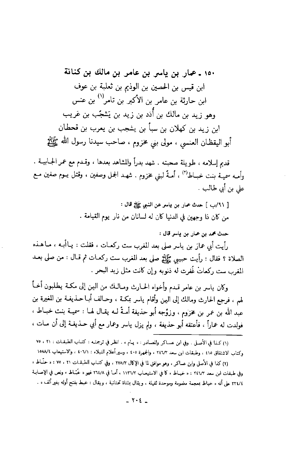 حدث محمد بن عمار بن ياسر قال: رأيت أبي عمار بن ياسر صلى بعد المغرب ست ركعات، فقلت: يا أبه، ما هذه الصلاة؟ فقال: رأيت حبيبي صلّى الله عليه وسلّم صلى بعد المغرب ست ركعات ثم قال: من صلى بعد المغرب ست ركعات غفرت له ذنوبه وإن كانت مثل زبد البحر.