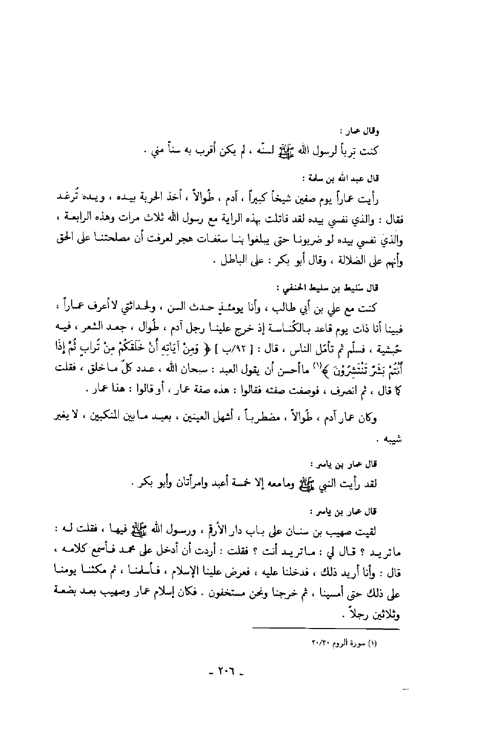قال سليط بن سليط الحنفي: كنت مع علي بن أبي طالب، وأنا يومئذٍ حدث السن، ولحداثتي لا أعرف عماراً، فبينا أنا ذات يوم قاعد بالكناسة إذ خرج علينا رجل آدم، طوال، جعد الشعر، فيه حبشية، فسلّم ثم تأمّل الناس، قال: " ومن آياته أن خلقكم من ترابٍ ثمّ إذا أنتم بشرٌ تنتشرون " ما أحسن أن يقول العبد: سبحان الله، عدد كلّ ما خلق، فقلت كما قال، ثم انصرف، فوصفت صفته، فقالوا: هذه صفة عمار، أو قالوا: هذا عمار.
