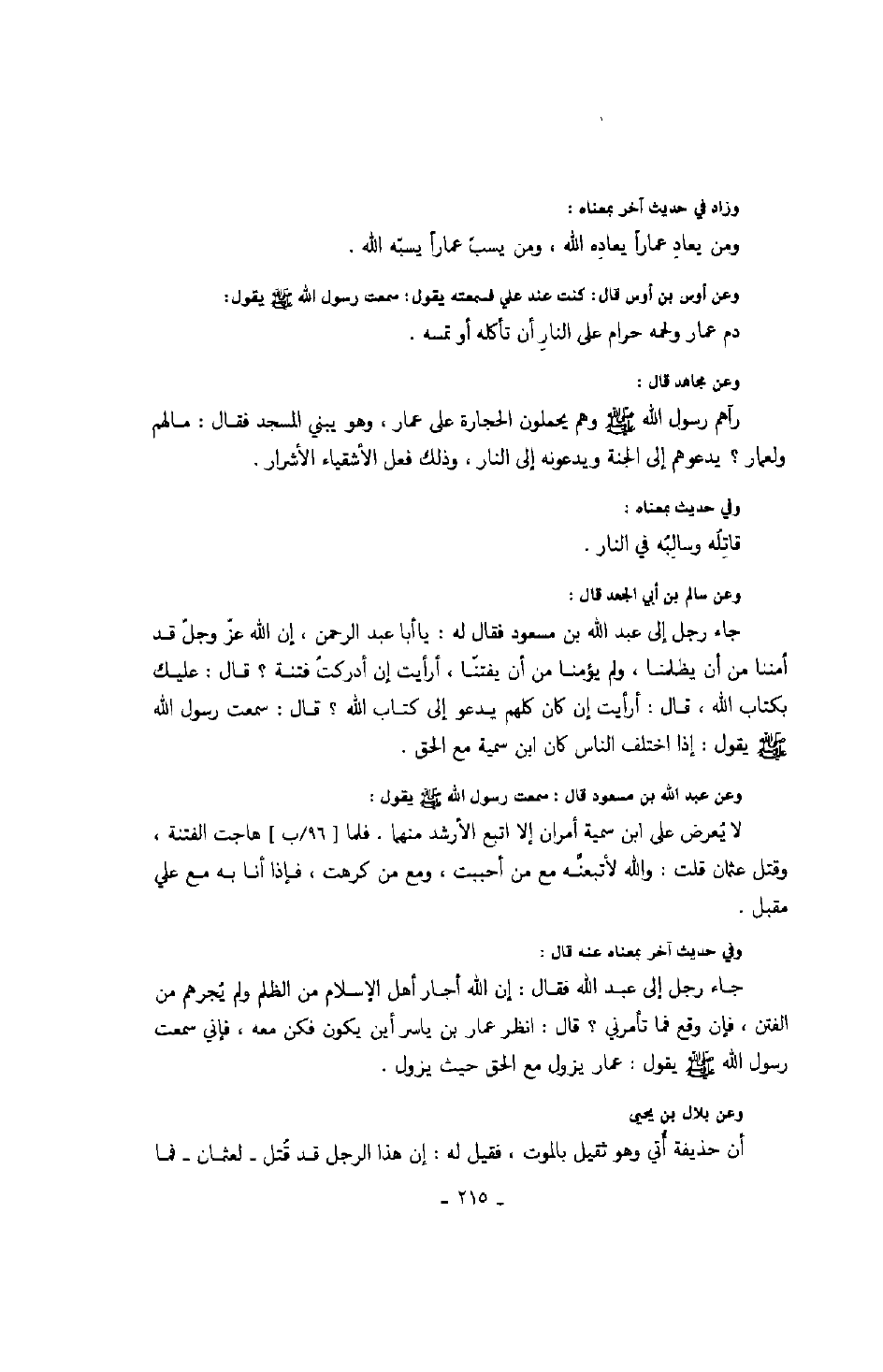 وعن سالم بن أبي الجعد قال: جاء رجل إلى عبد الله بن مسعود فقال له: يا أبا عبد الرحمن، إن الله عزّ وجلّ قد أمننا من أن يظلمنا، ولم يؤمنّا من أن يفتنّا، أرأيت عن أدركت فتنة؟ قال: عليك بكتاب الله، قال: أرأيت إن كان كلهم يدعو إلى كتاب الله؟ قال: سمعت رسول الله صلّى الله عليه وسلّم يقول: " إذا اختلف الناس كان ابن سمية مع الحق ".