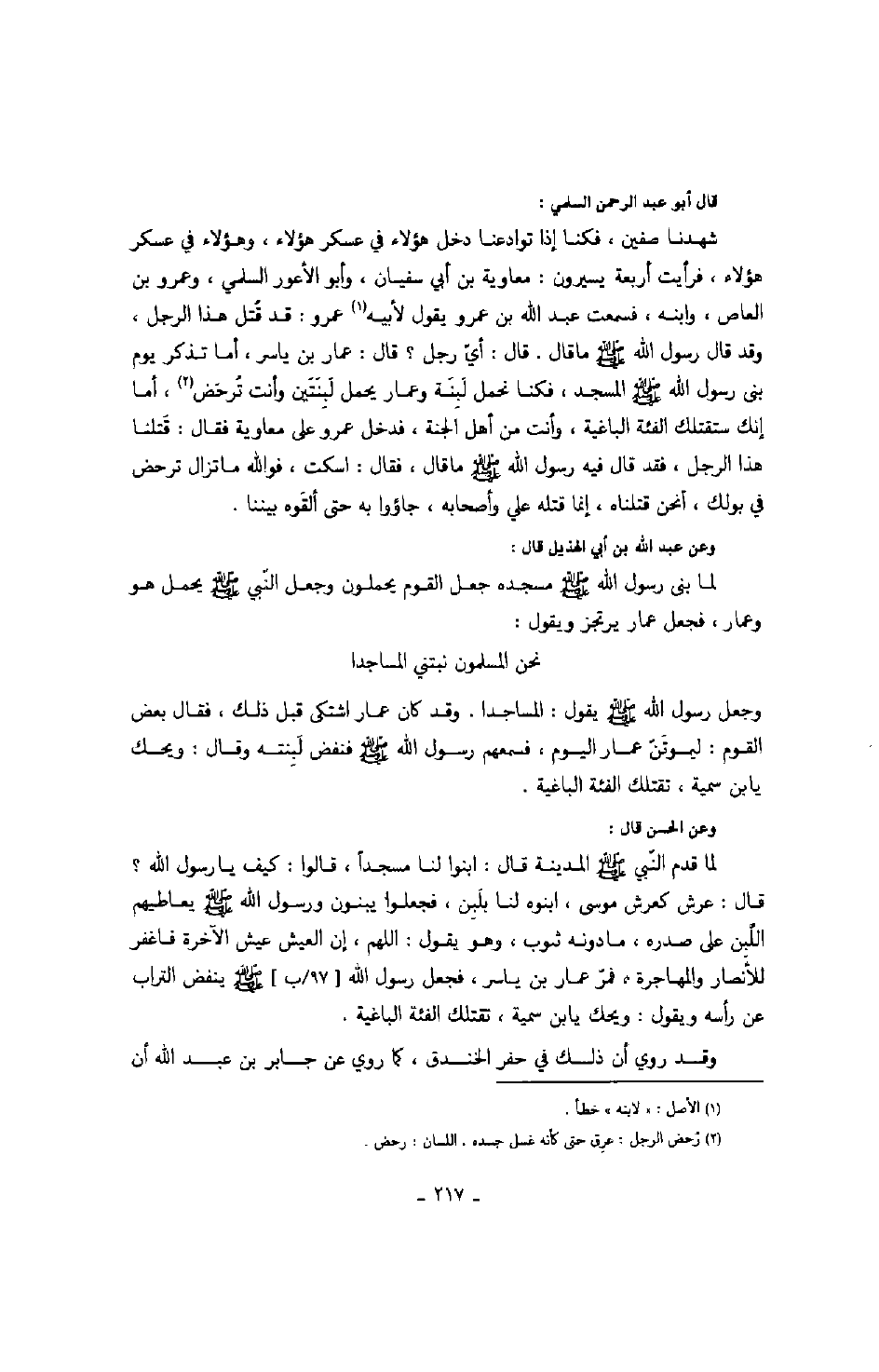 قال أبو عبد الرحمن السلمي: شهدنا صفين، فكنا إذا تواعدنا دخل هؤلاء في عسكر هؤلاء، وهؤلاء في عسكر هؤلاء، فرأيت أربعة يسيرون: معاوية بن أبي سفيان، وأبو الأعور السلمي، وعمرو بن العاص، وابنه، فسمعت عبد الله بن عمرو يقول لأبيه عمرو: قد قتل هذا الرجل، وقد قال رسول الله صلّى الله عليه وسلّم ما قال. قال: أيّ رجل؟ قال: عمار بن ياسر، أما تذكر يوم بنى رسول الله صلّى الله عليه وسلّم المسجد، فكنا نحمل لبنة وعمار يحمل لبنتين وأنت ترحض، أما إنك ستقتلك الفئة الباغية، وأنت من أهل الجنة، فدخل عمرو على معاوية فقال: قتلنا هذا الرجل، فقد قال فيه رسول الله صلّى الله عليه وسلّم ما قال، فقال: اسكت، فوالله ما تزال ترحض في بولك، أنحن قتلناه، إنما قتله علي وأصحابه، جاؤوا به حتى ألقوه بيننا.