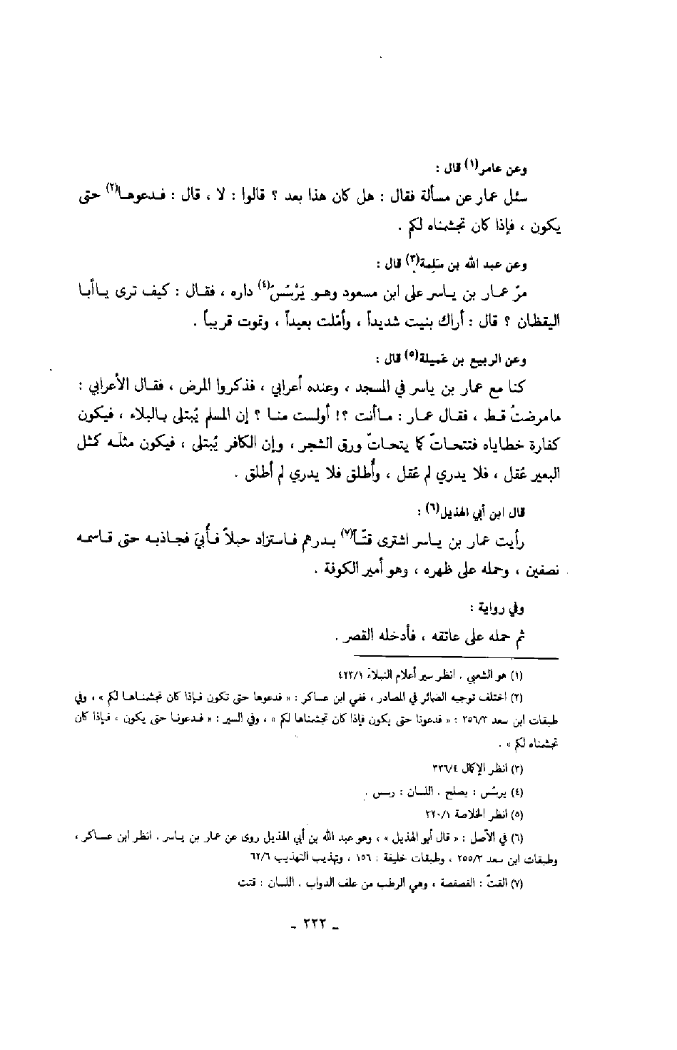 وعن الربيع بن عميلة قال: كنا مع عمار بن ياسر في المسجد، وعنده أعرابي، فذكروا المرض، فقال الأعرابي: ما مرضت قط، فقال عمار: ما أنت؟! أولست منا؟ إن المسلم يبتلى بالبلاء، فيكون كفارة خطاياه فتتحاتّ كما يتحاتّ ورق الشجر، وإن الكافر يبتلى، فيكون مثله كمثل البعير عقل، فلا يدري لم عقل، وأطلق فلا يدري لم أطلق.