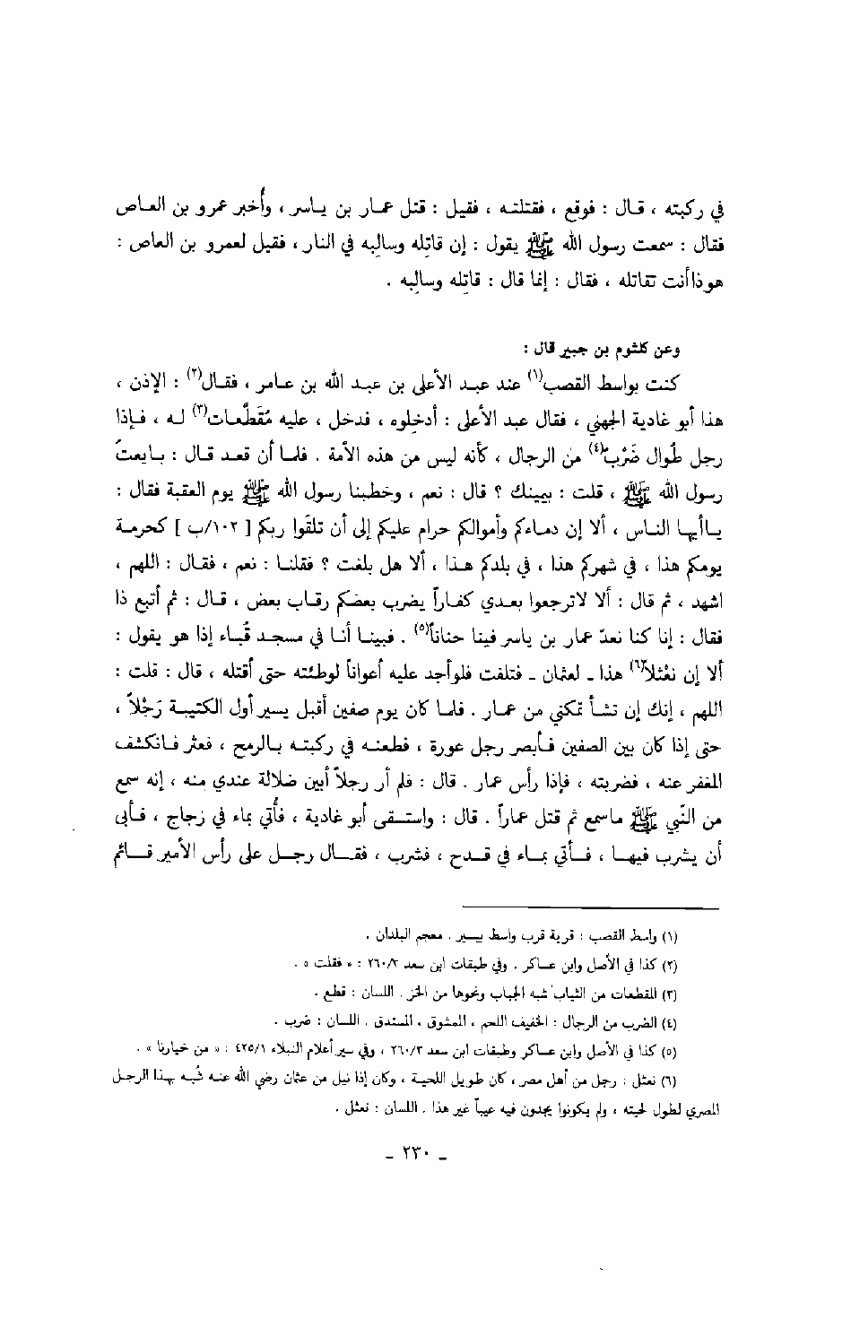 في ركبته، قال: فوقع، فقتلته، فقيل: قتل عمار بن ياسر، وأخبر عمرو بن العاص فقال: سمعت رسول الله صلّى الله عليه وسلّم يقول: " إن قاتله وسالبه في النار "، فقيل لعمرو بن العاص: هوذا أنت تقاتله، فقال: إنما قال: " قاتله وسالبه ".