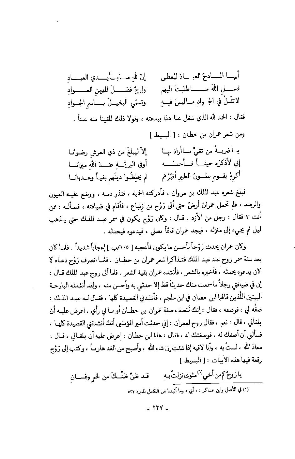 وكان عمران يحدث روحاً بأحسن ما يكون وأعجبه إعجاباً شديداً. فلما كان بعد سنة سمر روح عند عبد الملك فتذاكرا شعر عمران بن حطان. فلما انصرف روح دعاه كما كان يدعوه يحدثه، فأخبره بالشعر، فأنشد عمران بقية الشعر. فلما أتى روح عبد الملك قال: إن في ضيافتي رجلاً ما سمعت منك حديثاً قط إلا حدثني به وأحسن منه، ولقد أنشدته البارحة البيتين اللّذين قالهما ابن حطان في ابن ملجم، فأنشدني القصيدة كلها، فقال له عبد الملك: صفه لي، فوصفه، فقال: إنك لتصف صفة عمران بن حطان أو ما لي رأي، اعرض عليه أن يلقاني، قال: نعم، فقال روح لعمران: إني حدثت أمير المؤمنين أنك أنشدتني القصيدة كلها، فسألني أن أصفك له، فوصفتك له، فقال: هذا ابن حطان، اعرض عليه أن يلقاني، قال: معاذ الله، لست به، وأنا لاقيه إذا شئت إن شاء الله، وأصبح من الغد هارباً، وكتب إلى روح رقعة فيها هذه الأبيات: البسيط