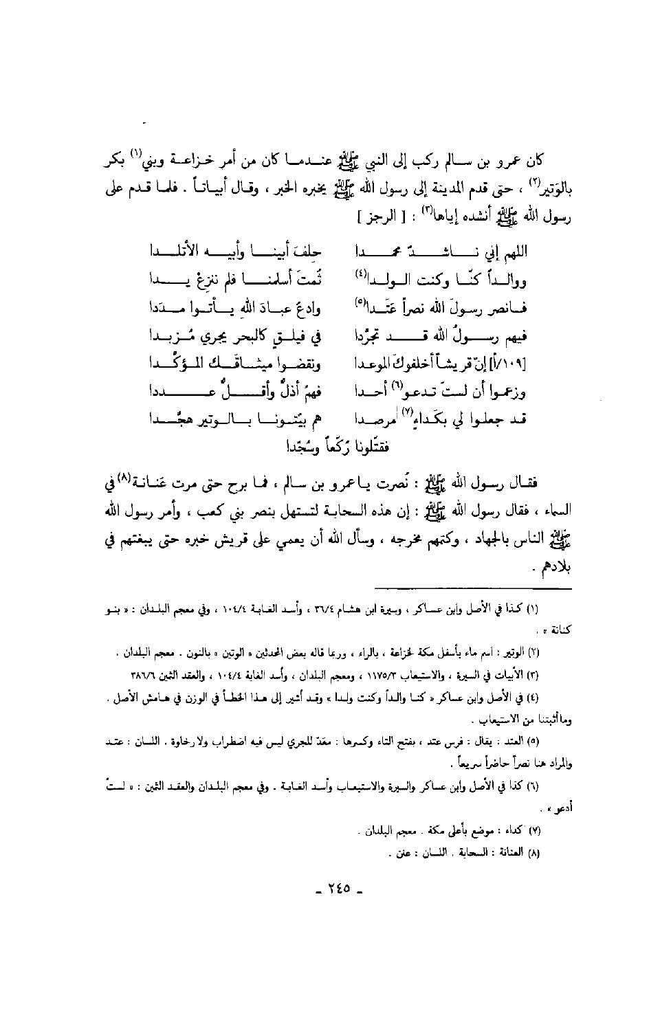 كان عمرو بن سالم ركب إلى النبي صلّى الله عليه وسلّم عندما كان من أمر خزاعة وبين بكر بالوتير، حتى قدم المدينة إلى رسول الله صلّى الله عليه وسلّم يخبره الخبر، وقال أبياتاً. فلما قدم على رسول الله صلّى الله عليه وسلّم أنشده إياها: الرجز