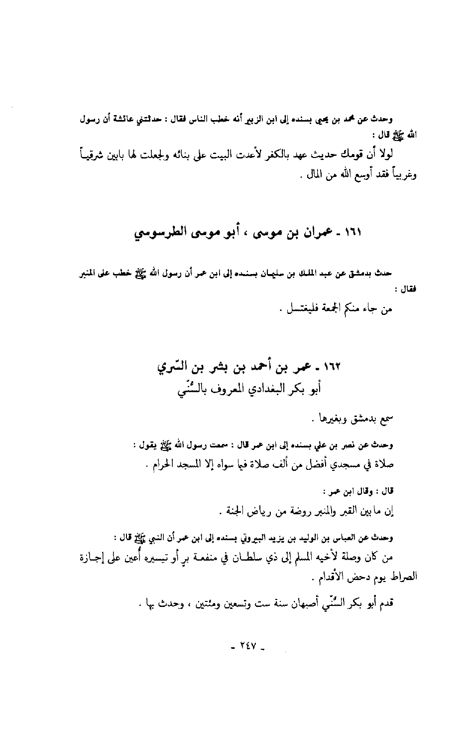 وحدث عن العباس بن الوليد بن يزيد البيروتي بسنده إلى ابن عمر أن النبي صلّى الله عليه وسلّم قال: " من كان وصلة لأخيه المسلم إلى ذي سلطان في منفعة برٍ أو تيسير أعين على إجازة الصراط يوم دحض الأقدام ".