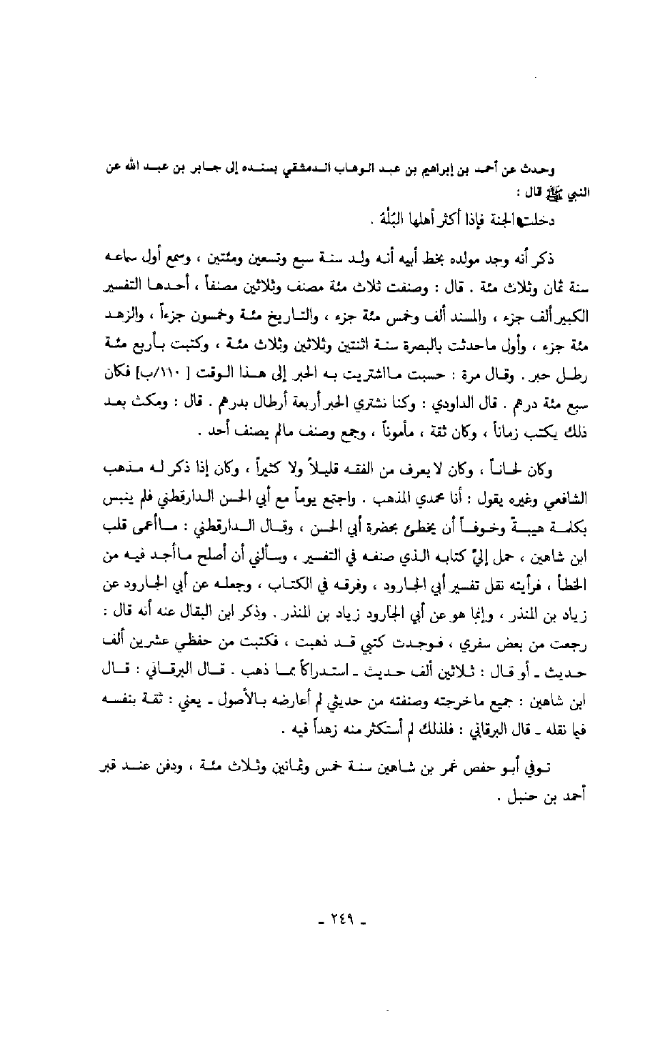 وحدث عن أحمد بن إبراهيم بن عبد الوهاب الدمشقي بسنده إلى جابر بن عبد الله عن النبي صلّى الله عليه وسلّم قال: " دخلت الجنة فإذا أكثر أهلها البله ".