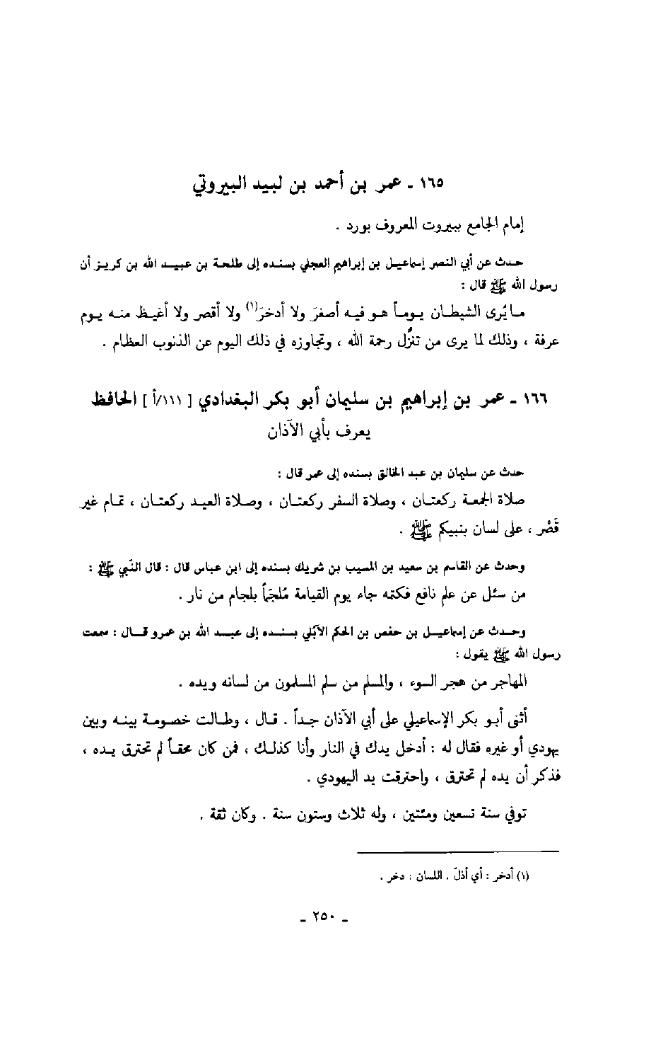أبو بكر البغدادي الحافظ يعرف بأبي الآذان حدث عن سليمان بن عبد الخالق بسنده إلى عمر قال: صلاة الجمعة ركعتان، وصلاة السفر ركعتان، وصلاة العيد ركعتان، تمام غير قصر، على لسان نبيكم صلّى الله عليه وسلّم.