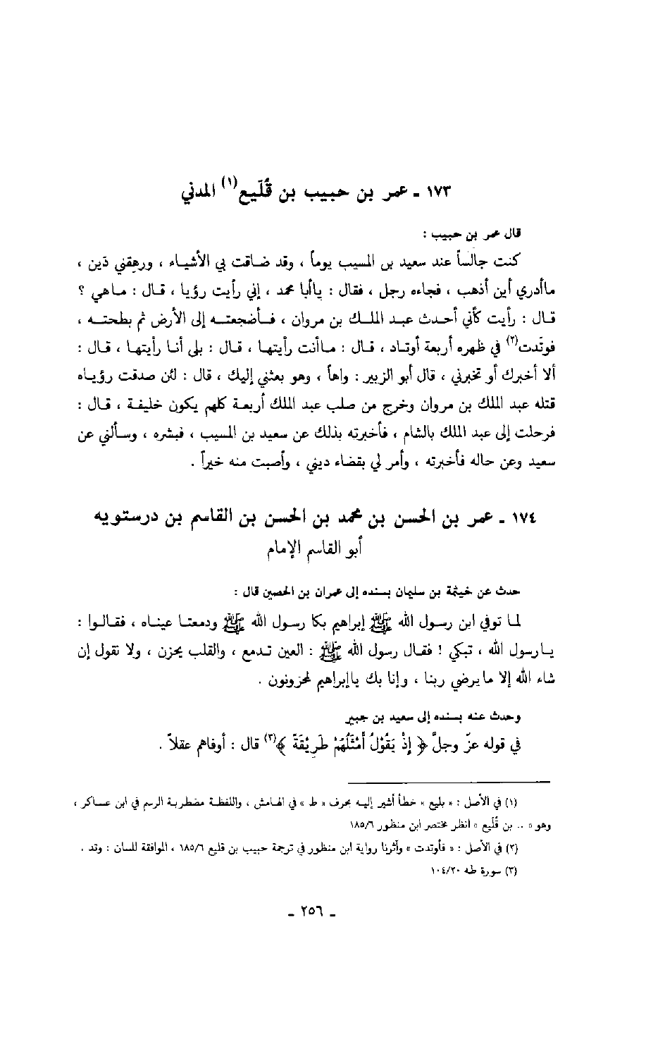 ابن الحسن بن القاسم بن درستويه أبو القاسم الإمام حدث عن خيثمة بن سليمان بسنده إلى عمران بن الحصين قال: لما توفي ابن رسول الله صلّى الله عليه وسلّم إبراهيم بكا رسول الله صلّى الله عليه وسلّم ودمعتا عيناه، فقالوا: يا رسول الله، تبكي! فقال رسول الله صلّى الله عليه وسلّم: " العين تدمع، والقلب يحزن، ولا نقول إن شاء الله إلا ما يرضي ربنا، وإنا يا إبراهيم لمحزونون ".