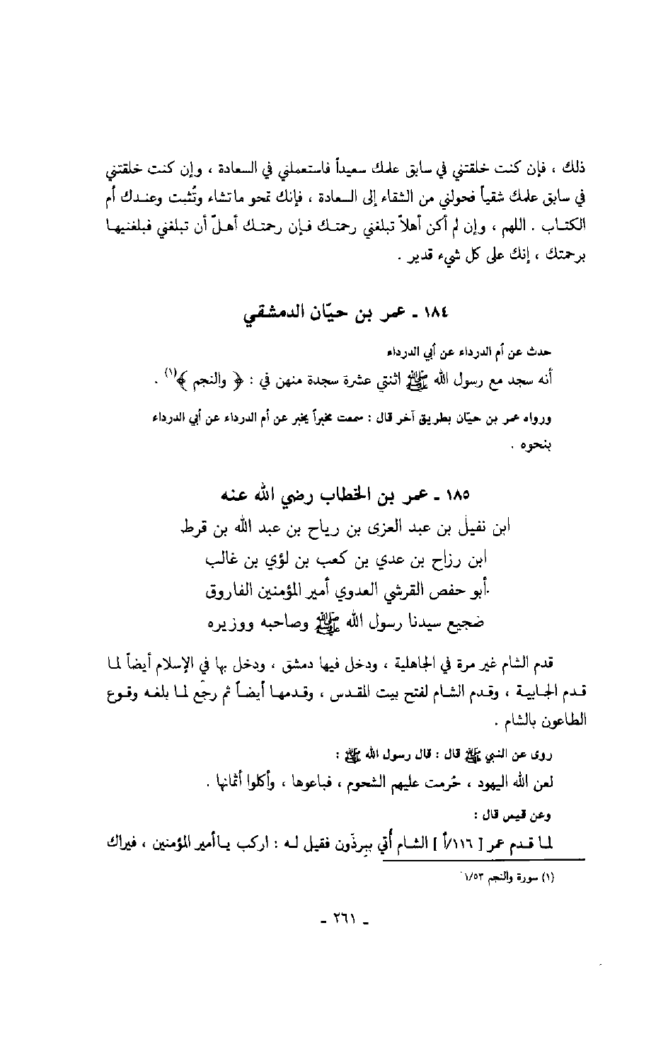 ابن نفيل بن عبد العزى بن رياح بن عبد الله بن قرط ابن رزاح بن عدي بن كعب بن لؤي بن غالب أبو حفص القرشي العدوي أمير المؤمنين الفاروق ضجيع سيدنا رسول الله صلّى الله عليه وسلّم وصاحبه ووزيره قدم الشام غير مرة في الجاهلية، ودخل فيها دمشق، ودخل بها في الإسلام أيضاً لما قدم الجابية، وقدم الشام لفتح بيت المقدس، وقدمها أيضاً ثم رجع لما بلغه وقوع الطاعون بالشام.