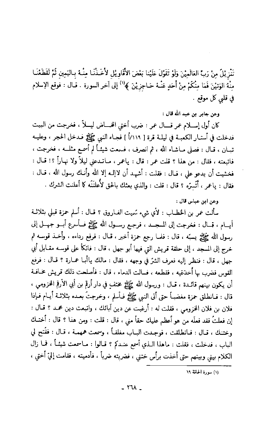 سألت عمر بن الخطاب: لأي شيء سميت الفاروق؟ قال: أسلم حمزة قبلي بثلاثة أيام، قال: فخرجت إلى المسجد، فرجع رسول الله صلّى الله عليه وسلّم فأسرع أبو جهل إلى رسول الله صلّى الله عليه وسلّم يسبّه، قال: فما رجع حمزة أخبر، قال: فرفع رداءه، وأخذ قوسه ثم خرج إلى المسجد، إلى حلقة قريش التي فيها أبو جهل، قال: فاتكأ على قوسه مقابل أبي جهل، قال: فنظر إليه فعرف الشرّ في وجهه، فقال: ما لك يا أبا عمارة؟ قال فرفع القوس فضرب بها أخدعيه، فقطعه، فسالت الدماء، قال: فأصلحت ذلك قريش مخافة أن يكون بينهم قائدة، قال: ورسول الله صلّى الله عليه وسلّم مختفٍ في دار أرقم بن أبي الأرقم المخزومي، قال: فانطلق حمزة مغضباً حتى أتى النبي صلّى الله عليه وسلّم فأسلم، وخرجت بعده بثلاثة أيام، فإذا فلان بن فلان المخزومي، فقلت له: أرغبت عن دين آبائك، واتبعت دين محمد؟ قال: إن فعلت فقد فعله من هو أعظم عليك حقاً مني، قال: قلت: ومن هذا؟ قال أختك وختنك، قال: فانطلقت، فوجدت الباب مغلقاً، وسمعت همهمة، قال: ففتح لي الباب، فدخلت، فقلت: ما هذا الذي أسمع عندكم؟ قالوا: ما سمعت شيئاً، فما زال الكلام بيني وبينهم حتى برأس ختني، فضربته ضرباً، فأدميته، فقامت إليّ أختي،
