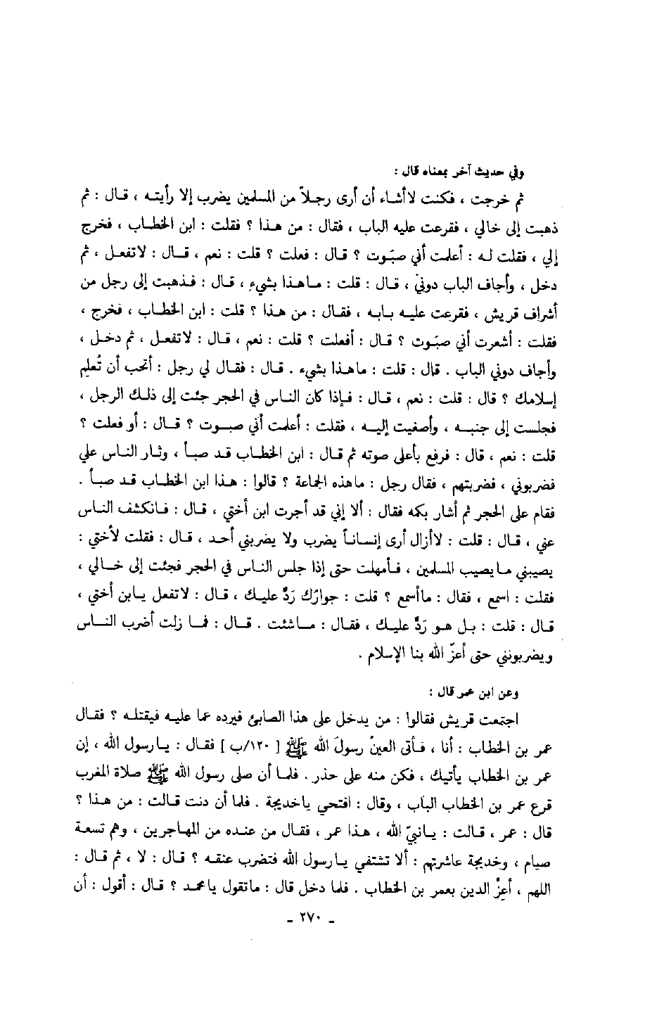ثم خرجت، فكنت لا أشاء أن أرى رجلاً من المسلمين يضرب إلا رأيته، قال: ثم ذهبت إلى خالي، فقرعت عليه الباب، فقال: من هذا؟ فقلت: ابن الخطاب، فخرج إلي، فقلت له: أعلمت أني صبوت؟ قال: فعلت؟ قلت: نعم، قال: لا تفعل، ثم دخل، وأجاف الباب دوني، قال: قلت: ما هذا بشيء، قال: فذهبت إلى رجل من أشراف قريش، فقرعت عليه بابه، فقال: من هذا؟ قلت: ابن الخطاب، فخرج، فقلت: أشعرت أني صبوت؟ قال: أفعلت؟ قلت: نعم، قال: لا تفعل، ثم دخل، وأجاف دوني الباب. قال: قلت: ما هذا بشيء. قال: فقال لي رجل: أتحب أن تعلم إسلامك؟ قال: قلت: نعم، قال: فإذا كان الناس في الحجر جئت إلى ذلك الرجل، فجلست إلى جنبه، وأصغيت إليه، فقلت: أعلمت أني صبوت؟ قال: أو فعلت؟ قلت: نعم، قال: فرفع بأعلى صوته ثم قال: ابن الخطاب قد صبأ، وثار الناس علي فضربوني، فضربتهم، فقال رجل: ما هذه الجماعة؟ قالوا: هذه ابن الخطاب قد صبأ، فقام على الحجر ثم أشار بكمه فقال: ألا إني قد أجرت ابن أختي، قال: فقلت لأختي: يصيبني ما يصيب المسلمين، فأمهلت حتى إذا جاء الناس في الحجر فجئت إلى خالي، فقلت: اسمع، فقال: ما أسمع؟ قلت: جوادك ردٌّ عليك، قال: لا تفعل يا بن أختي، قال: قلت: بل هو ردٌّ عليك، فقال: ما شئت. قال: ما زلت أضرب الناس ويضربونني حتى أعزّ الله بنا الإسلام.