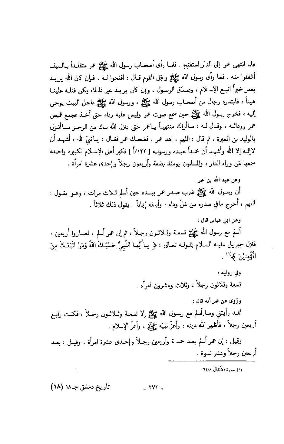 وعن ابن عباس قال: أسلم مع رسول الله صلّى الله عليه وسلّم تسعة وثلاثون رجلاً، ثم إن عمر أسلم، فصاروا أربعين، فنزل جبريل عليه السلام بقوله تعالى: " يا أيّها النّبيّ حسبك الله ومن اتّبعك من المؤمنين ".