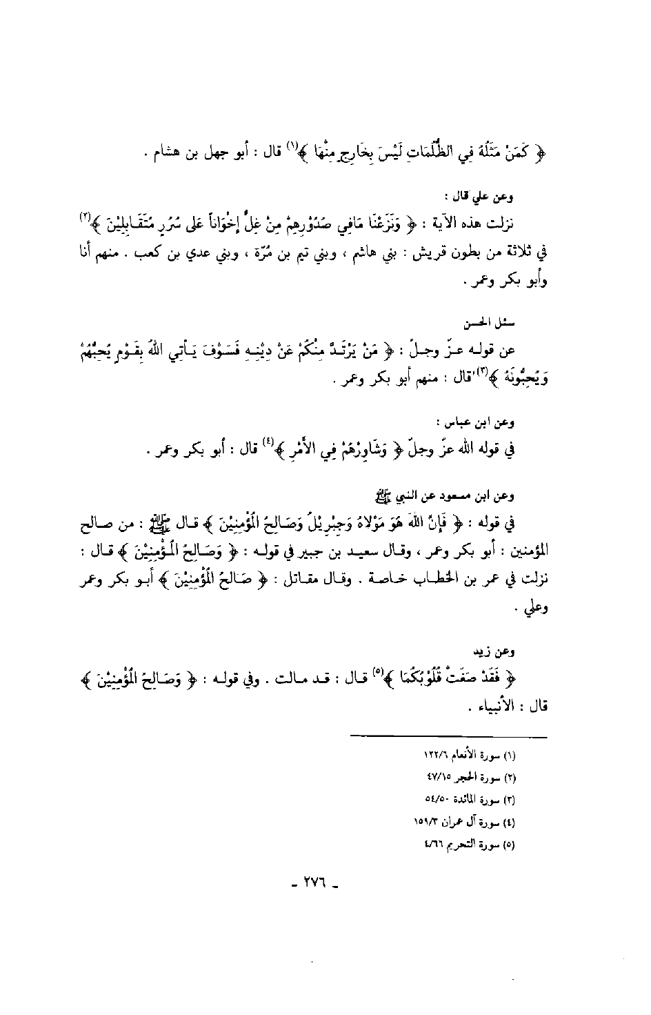 وعن ابن مسعود عن النبي صلّى الله عليه وسلّم: في قوله: " فإنّ الله هو مولاه وجبريل وصالح المؤمنين " قال صلّى الله عليه وسلّم: " من صالح المؤمنين: أبو بكر وعمر "، وقال سعيد بن جبير في قوله: " وصالح المؤمنين " قال: نزلت في عمر بن الخطاب خاصة. وقال مقاتل: " صالح المؤمنين " أبو بكر وعمر وعلي.
