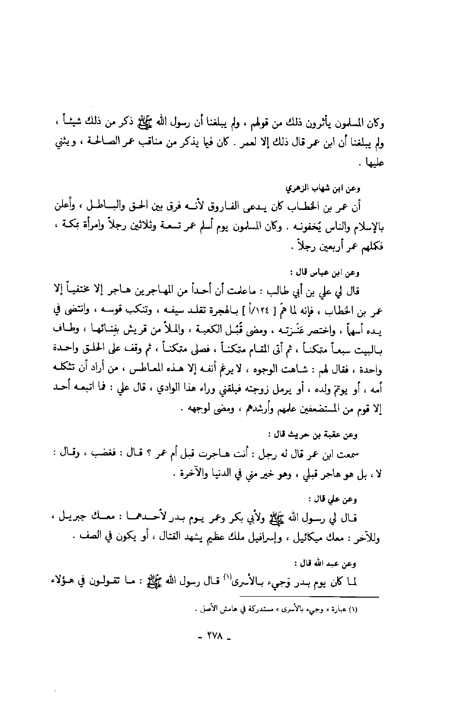 وكان المسلمون يأثرون ذلك من قولهم، ولم يبلغنا أن رسول الله صلّى الله عليه وسلّم ذكر من ذلك شيئاً، ولم يبلغنا أن ابن عمر قال ذلك إلا لعمر. كان فيما يذكر من مناقب عمر الصالحة، ويثني عليها.