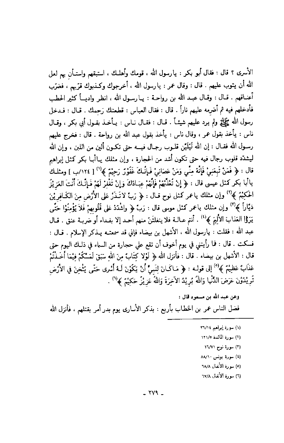 الأسرى؟ " قال: فقال أبو بكر: يا رسول الله، قومك وأهلك، استبقهم واستأن بهم لعل الله أن يتوب عليهم. قال: وقال عمر: يا رسول الله، أخرجوك وكذبوك قرّبهم، فضرّب أعناقهم. قال: وقال عبد الله بن رواحة: يا رسول الله، انظر وادياً كثير الحطب فأدخلهم فيه ثم أضرمه عليهم ناراً. قال: فقال العباس: قطعتك رحمك. قال: فدخل رسول الله صلّى الله عليه وسلّم ولم يرد عليهم شيئاً. قال: فقال ناس، يأخذ بقول أبي بكر، وقال ناس: يأخذ بقول عمر، وقال ناس: يأخذ بقول عبد الله بن رواحة. قال: فخرج عليهم رسول الله فقال: " إن الله ليليّن قلوب رجال فيه حتى تكون ألين من اللبن، وإن الله ليشدّد قلوب رجال فيه حتى تكون أشد من الحجارة، وإن مثلك يا أبا بكر كمثل إبراهيم قال: " فمن تبعني فإنّه منّي ومن عصاني فإنّك غفورٌ رحيمٌ " ومثلك يا أبا بكر كمثل عيسى قال: " إن تعذّبهم فإنّهم عبادك وغن تغفر لهم فإنّك أنت العزيز الحكيم " وإن مثلك يا عمر كمثل نوح قال: " ربّ لا تذر على الأرض من الكافرين ديّاراً " وإن مثلك يا عمر كمثل موسى قال: ربّ " واشدد على قلوبهم فلا يؤمنوا حتّى يروا العذاب الأليم ". أنتم عالة فلا ينفلتنّ منهم أحد إلا بفداء أو ضربة عنق ". قال عبد الله: فقلت: يا رسول الله، الأشهل بن بيضاء فإني قد سمعته يذكر الإسلام. قال: فسكت. قال: فما رأيتني في يوم أخوف أن تقع علي حجار من السماء في ذلك اليوم حتى قال: " الأشهل بن بيضاء ". قال: فأنزل الله "