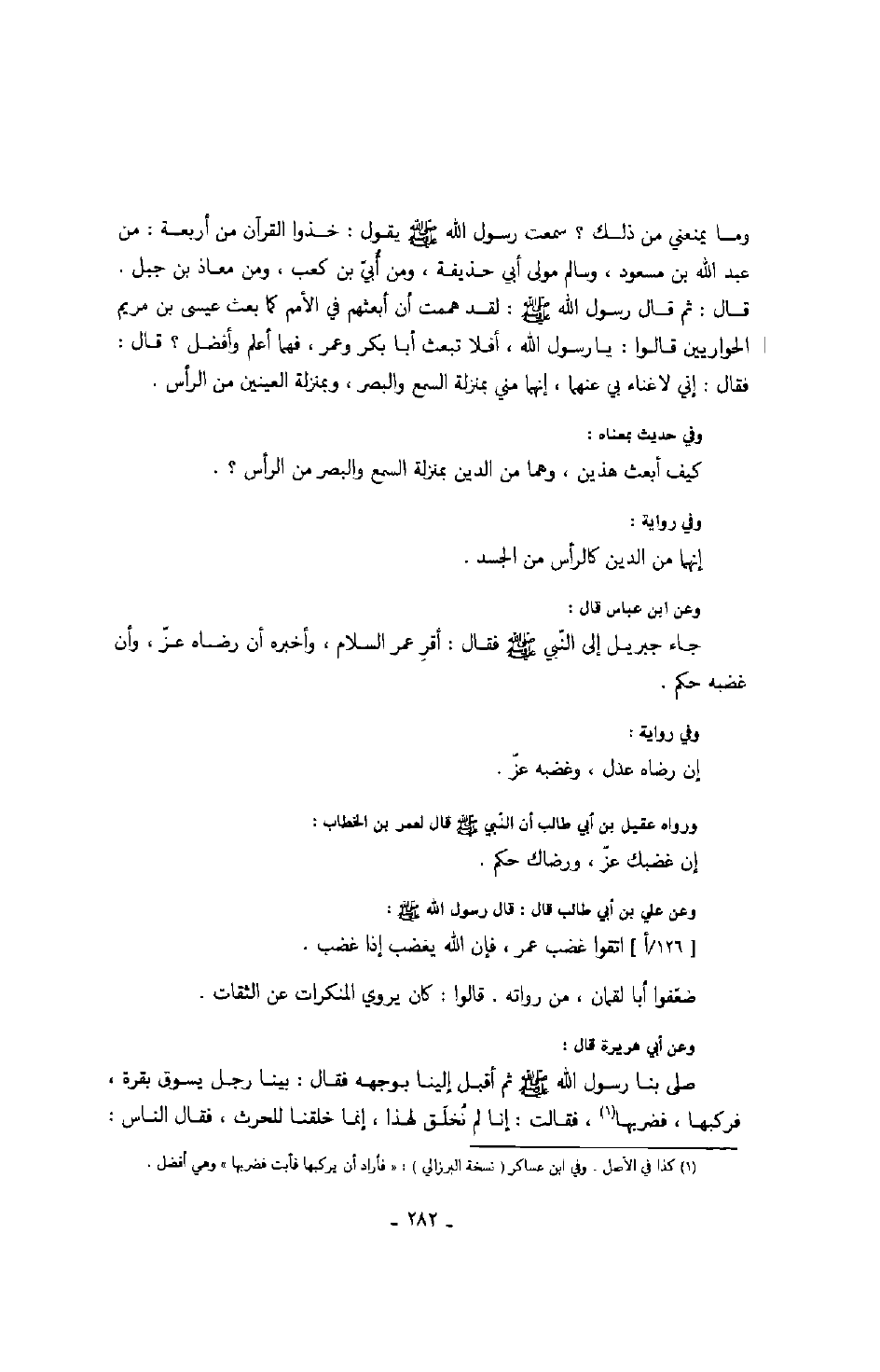 ورواه عقيل بن أبي طالب أن النّبي صلّى الله عليه وسلّم قال لعمر بن الخطاب: " إن غضبك عزّ، ورضاك حكم ".