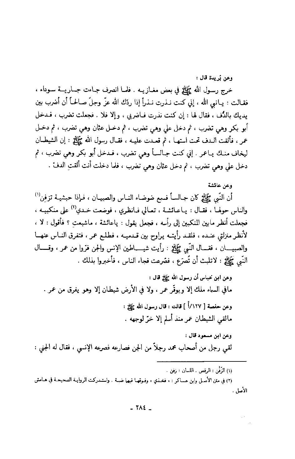 عن بريدة قال: خرج رسول الله صلّى الله عليه وسلّم في بعض مغازيه. فلما انصرف جاءت جارية سوداء، فقالت: يا نبي الله، إني كنت نذرت نذراً إذا ردّك الله عزّ وجلّ صالحاً أن أضرب بين يديك بالدّف، فقال لها: " إن كنت نذرت فاضربي، وإلا فلا ". فجعلت تضرب، فدخل أبو بكر وهي تضرب، ثم دخل علي وهي تضرب، ثم دخل عثمان وهي تضرب، ثم دخل عمر، فألقت الدف تحت استها، ثم قعدت عليه، فقال رسول الله صلّى الله عليه وسلّم: " إن الشيطان ليخاف منك يا عمر. إني كنت جالساً وهي تضرب، فدخل أبو بكر وهي تضرب، ثم دخل علي وهي تضرب، ثم دخل عثمان وهي تضرب، فلما دخلت أنت ألقت الدفّ ".
