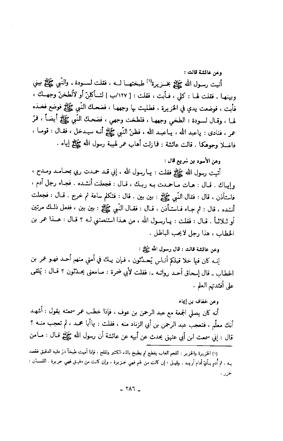 وعن عائشة قالت: أتيت رسول الله صلّى الله عليه وسلّم بخزيرة طبختها له، فقلت لسودة والنّبي صلّى الله عليه وسلّم بيني وبينها فقلت لها: كلي، فأبت، فقلت: لتأكلنّ أو لألطخنّ وجهك، فأبت، فوضعت يدي في الخزيرة، فطليت بها وجهها، فضحك النّبي صلّى الله عليه وسلّم فوضع فخذه لها، وقال لسودة: " الطخي وجهها "، فلطخت وجهين فضحك النّبي صلّى الله عليه وسلّم أيضاً، فمرّ عمر، فنادى: يا عبد الله، يا عبد الله، فظنّ النّبي صلّى الله عليه وسلّم أنه سيدخل، فقال: " قوما، فاغسلا وجوهكما ". قالت عائشة: فما زلت أهاب عمر لهيبة رسول الله صلّى الله عليه وسلّم إياه.